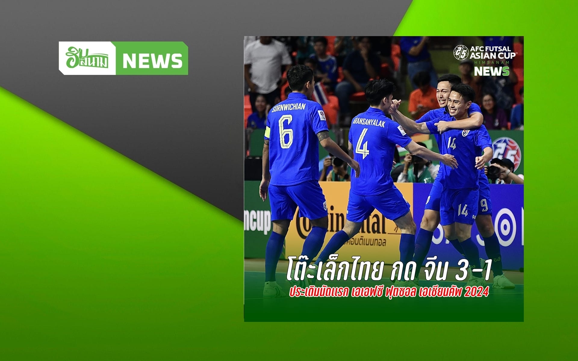 ฟุตซอลทีมชาติไทย รัว 3 ลูกในครึ่งแรก อภิวัฒน์ แจ่มเจริญ-ศุภวุฒิ เถื่อนกลาง เเละ มูฮัมหมัด อุสมานมูซา คนละเม็ด ก่อนที่ทีมชาติจีนจะงัดเพาเวอร์เพลย์สู้แต่หัววัน ท้ายเกมจีนเจาะตีไข่แตก เป็น 3 แต้มแรกของฟุตซอลไทย ท่ามกลางแฟนบอลทะลักเฉียด 4,000 คน ตั๋วหมดก่อนแข่งร่วม 3 ชั่วโมง นับหนึ่งชิงตั๋วฟุตซอลโลก2024 เกมหน้าดวล เมียนมา ที่นัดแรกยันเจ๊า เวียดนาม 1-1 คิกออฟศุกร์นี้ 18.00 น. T Sports 7 ถ่ายทอดสด