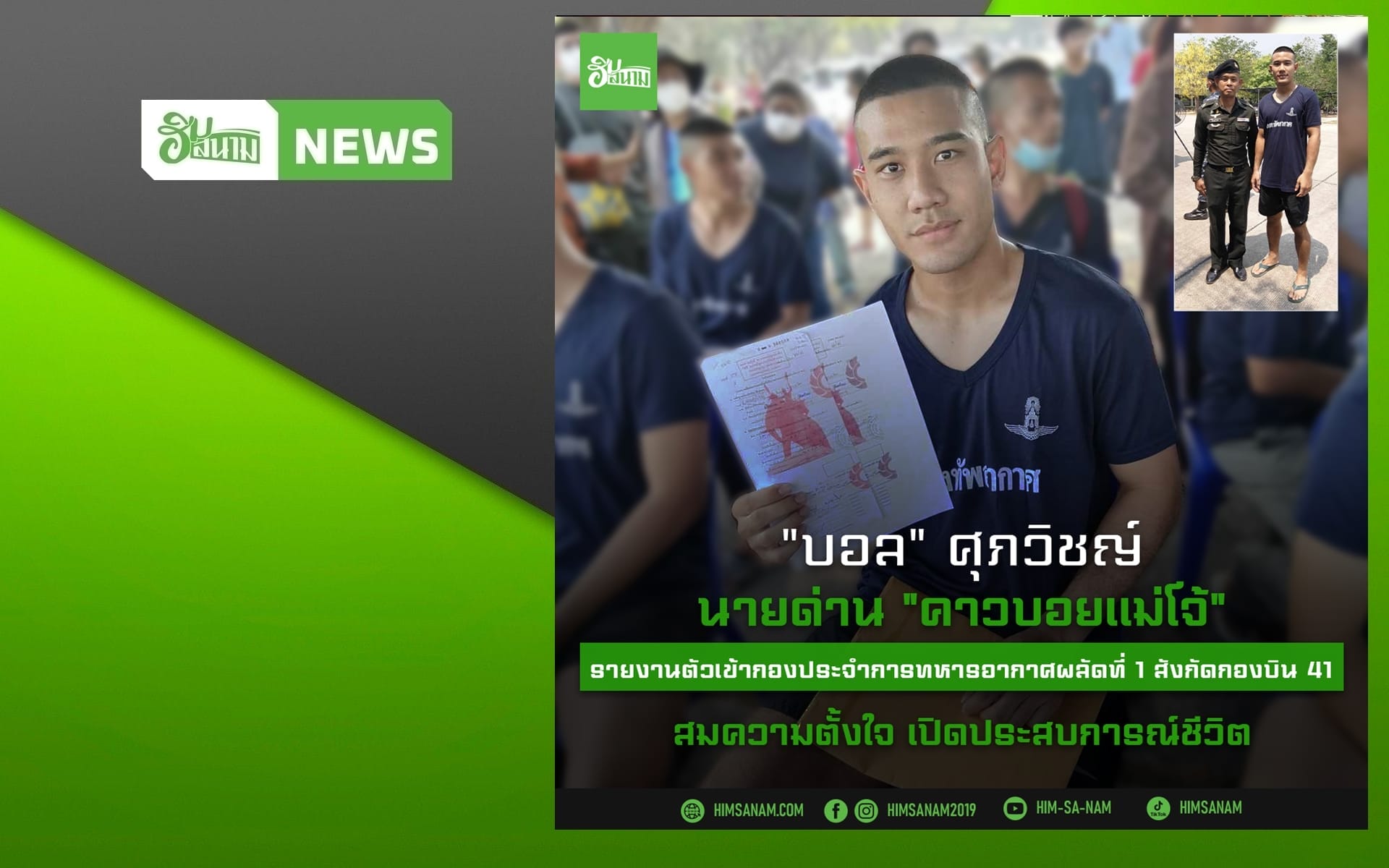 “บอล” ศุภวิชญ์ ช่างเหล็ก นายด่าน “คาวบอยแม่โจ้” แม่โจ้ ยูไนเต็ด วัย23 ปี ตบเท้ารายงานตัวเข้ากองประจำการทหารอากาศผลัดที่ 1 สังกัดกองบิน 41 จังหวัดเชียงใหม่ สมความตั้งใจหลังจบการศึกษาระดับปริญญาตรี