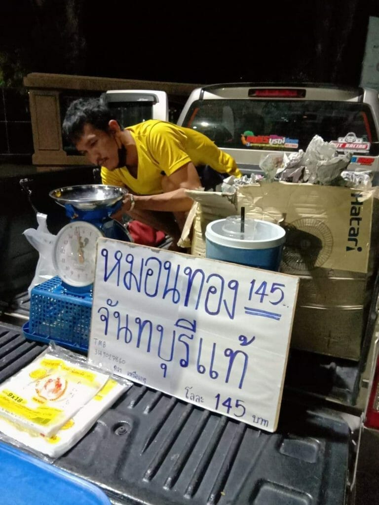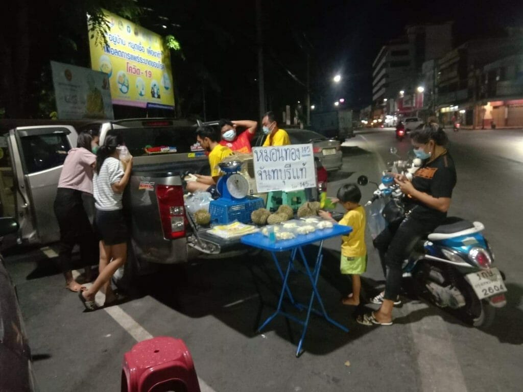 “เริ่มขายมาได้ระยะหนึ่งแล้วครับ ได้ความคิดมาจากน้อง คือผมเองก็เป็นคนชอบกินทุเรียนเลยไปถามน้องเขาว่าไปรับจากไหนมาขาย น้องเขาเลยแนะนำให้ ได้ราคาส่งเลยครับ มาแรกๆ ก็ชั่งกิโลขายปกติครับแต่ดูแล้วขายค่อนข้างยากเพราะเห็นบางร้านก็จะแกะแบ่งขาย ผมเองก็กลัวทุเรียนที่สั่งมาจะเน่าจะเสีย ก็เลยลองแกะขายดูบ้าง ก็เลยแกะขายมาจนถึงทุกวันนี้ครับ ถือว่าสร้างรายได้พออยู่พอกินเลยครับ