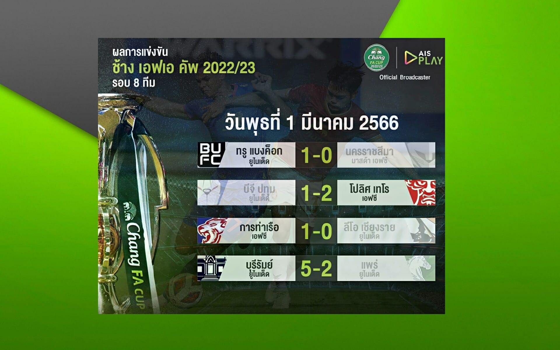 สรุปผลการแข่งขันฟุตบอล ช้าง เอฟเอ คัพ รอบก่อนรอบรองชนะเลิศที่ทำการแข่งขันในวันที่ 1 มีนาคม 2566 โดยผลการแข่งขันมีดังนี้