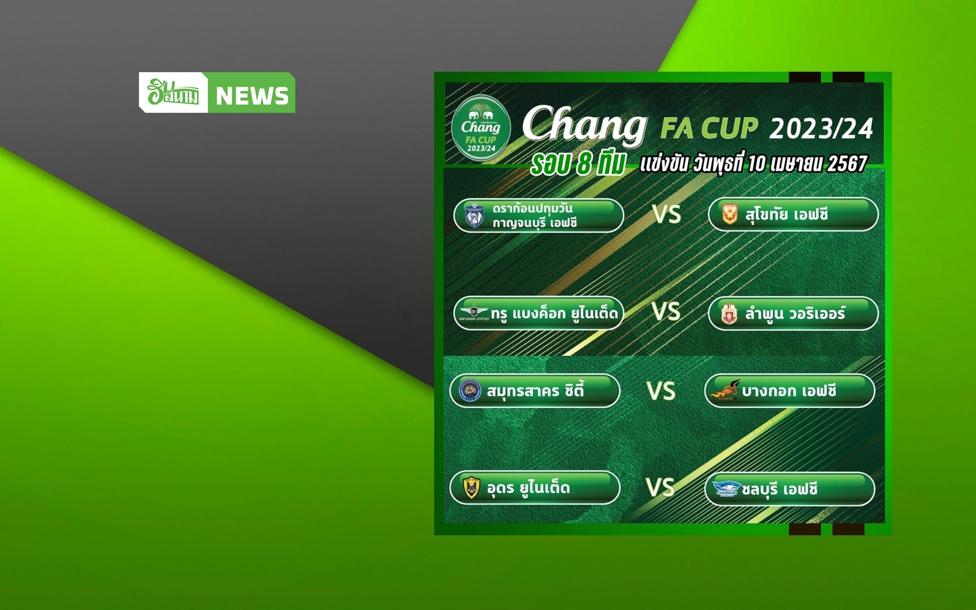 สำหรับ ช้าง เอฟเอ คัพ 2023/24 รอบ 8 ทีมสุดท้าย จะทำการแข่งขันในวันพุธที่ 10 เมษายน 2567 โดยเป็นการแข่งขันแบบน็อคเอาท์ แพ้คัดออก หากหมดเวลาการแข่งขันแล้วทั้งสองทีมยังเสมอกัน จะทำการต่อเวลาพิเศษครึ่งละ 15 นาที และหากยังไม่ทราบผลแพ้ชนะ จะตัดสินด้วยการเตะลูกโทษ ณ จุดโทษ เพื่อหาผู้ชนะเข้ารอบต่อไป
