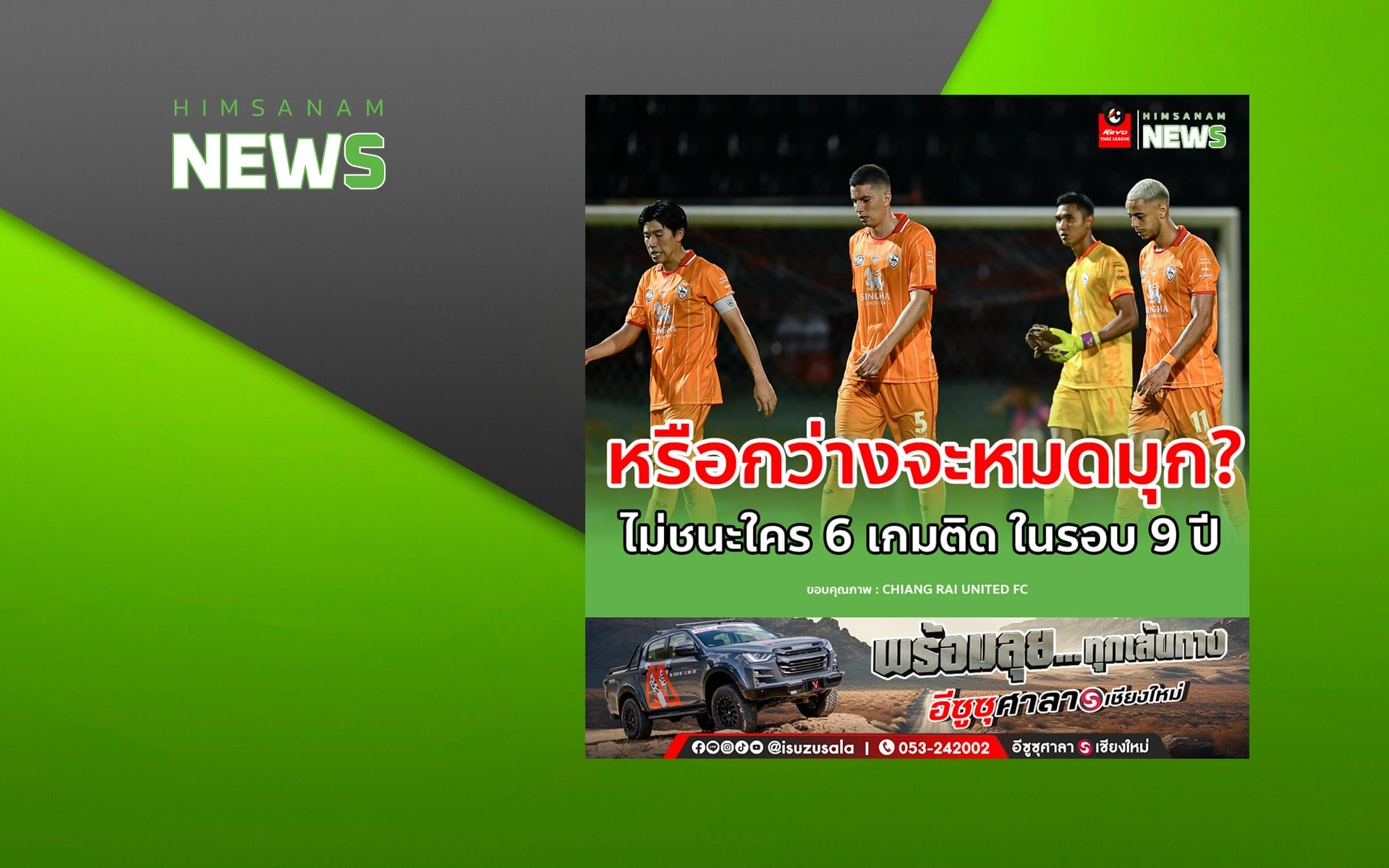 สิงห์ เชียงราย ยูไนเต็ด ผลงานเริ่มไม่สู้ดี หลังจากที่เกาะกลุ่มหัวตาราง สู่กลางตาราง ไม่ชนะใครมา 6 นัดติดต่อกันในลีก เสมอ 3 แพ้ 3 โดยครั้งล่าสุดที่ผลงานไม่ชนะใคร 6 นัดติด เกิดในช่วง สิงหาคม – ตุลาคม 2014 หรือเมื่อ 9 ปี ที่แล้ว ซึ่งตอนนี้ “กว่างโซ้งมหาภัย” รั้งอันดับ 8 มี 16 แต้ม ห่างจากโซนตกชั้นเพียง 4 แต้ม หรือว่า “เชียงราย” จะเริ่มหมดมุก หากเลคสองไม่ขยับหรือรีบหาความมั่นใจเดิมกลับมา ท้ายฤดูกาลเหนื่อยแน่ๆ