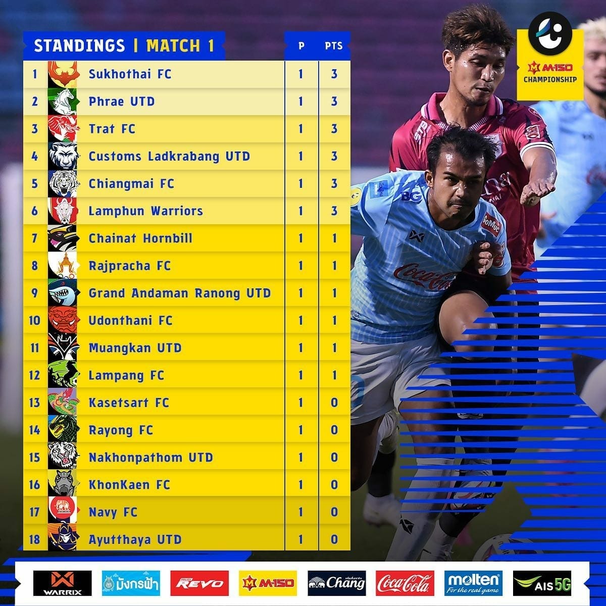 ไทยลีก 1 ภายใต้ชื่อการแข่งขันที่มีการปรับเปลี่ยนไปเล็กน้อย ภายใต้ชื่อการแข่งขันว่า “ไฮลักซ์ รีโว่ ไทยลีก : Hilux Revo Thai League” ส่วนของ ไทยลีก 2 ยังคงชื่อเดิมนั่นคือ “เอ็ม 150 แชมเปี้ยนชิพ : M-150 Championship” ส่วนไทยลีก 3 ภายใต้ชื่อการแข่งขันอย่างเป็นทางการว่า “มังกรฟ้าลีก : Bluedragon League”