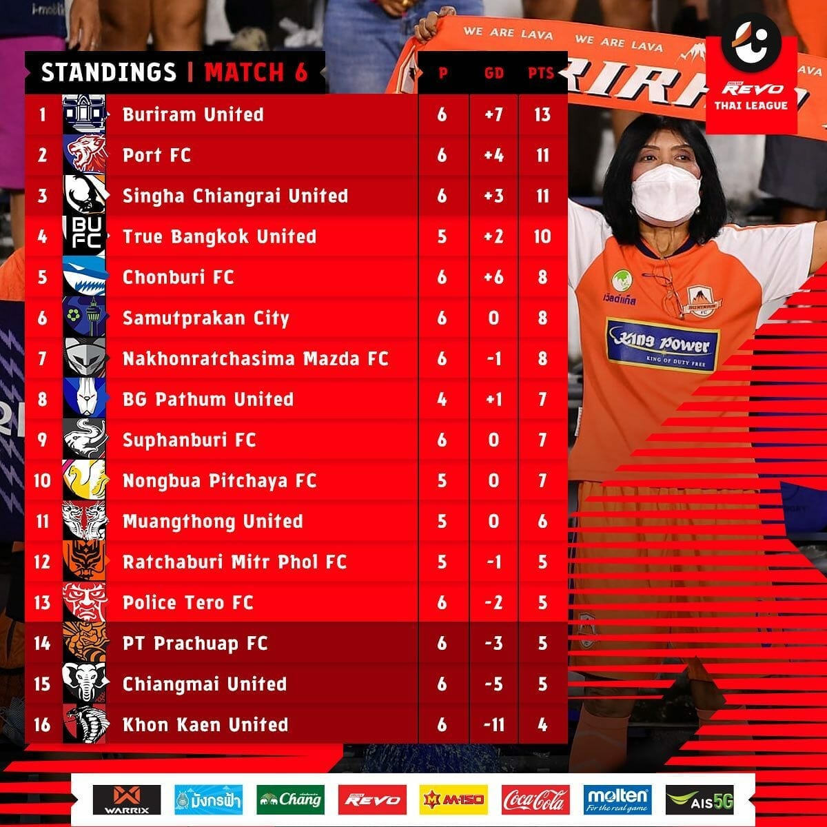 พวกเขามีคะแนนเท่ากับ พีที ประจวบ เอฟซี รวมถึงลูกได้เสียด้วย ส่วน โปลิศ เทโร เอฟซี และ ราชบุรี มิตรผล เอฟซี ก็มี 5 แต้มเท่ากัน แต่ลูกได้เสียดีกว่า