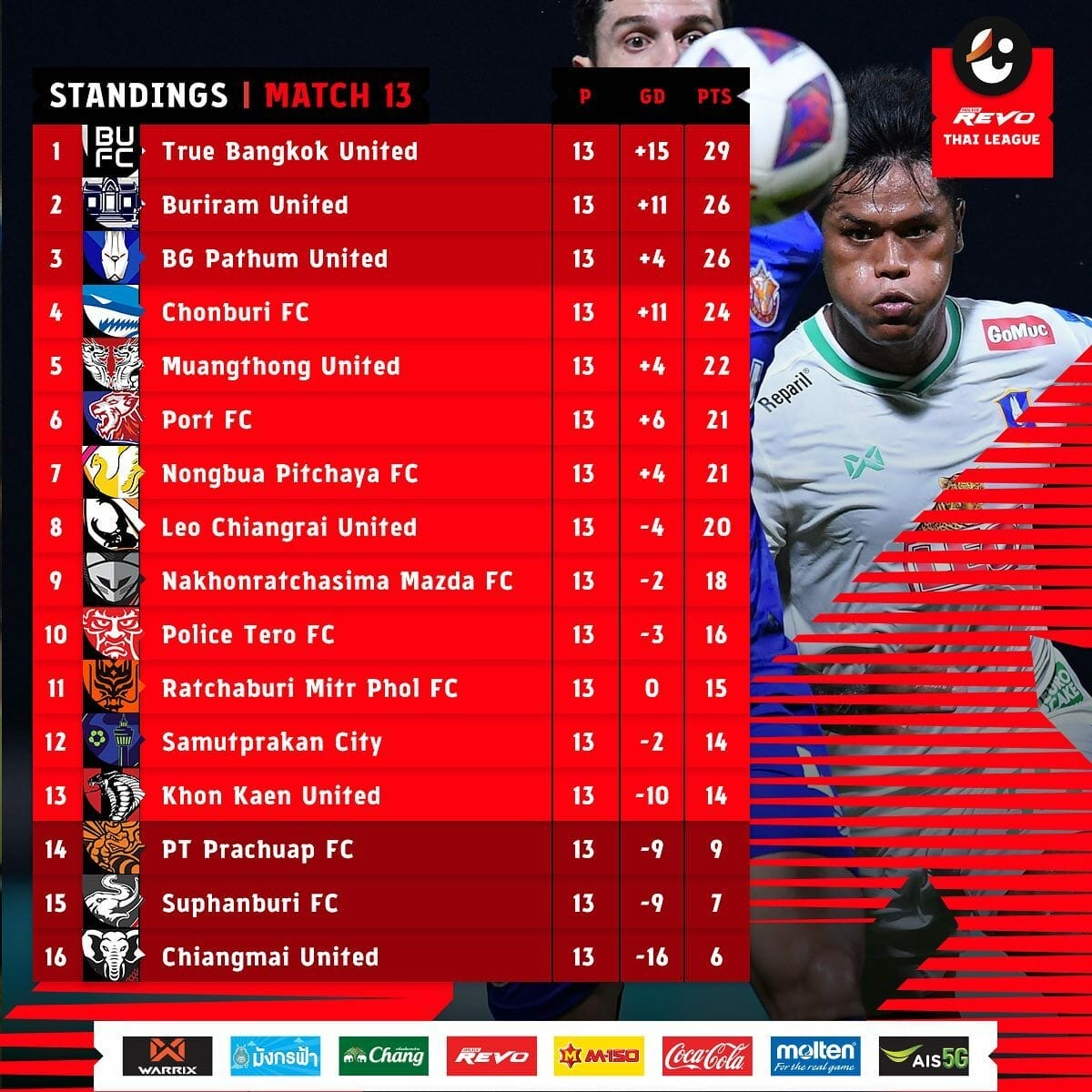 มาดูที่ผลการแข่งขัน ไทยลีก 1 หรือ “ไฮลักซ์ รีโว่ ไทยลีก” หลังจากผ่านแมทช์เดย์ที่ 13 จ่าฝูง “แข้งเทพ” ทรู แบงคอก ยูไนเต็ด ยังโชว์ฟอร์มเก็บชัยชนะอย่างต่อเนื่องเป็นนัดที่ 3 ล่าสุด แถมยังยิงไป 10 ลูกและเป็นคลีนชีตทั้ง 3 นัด