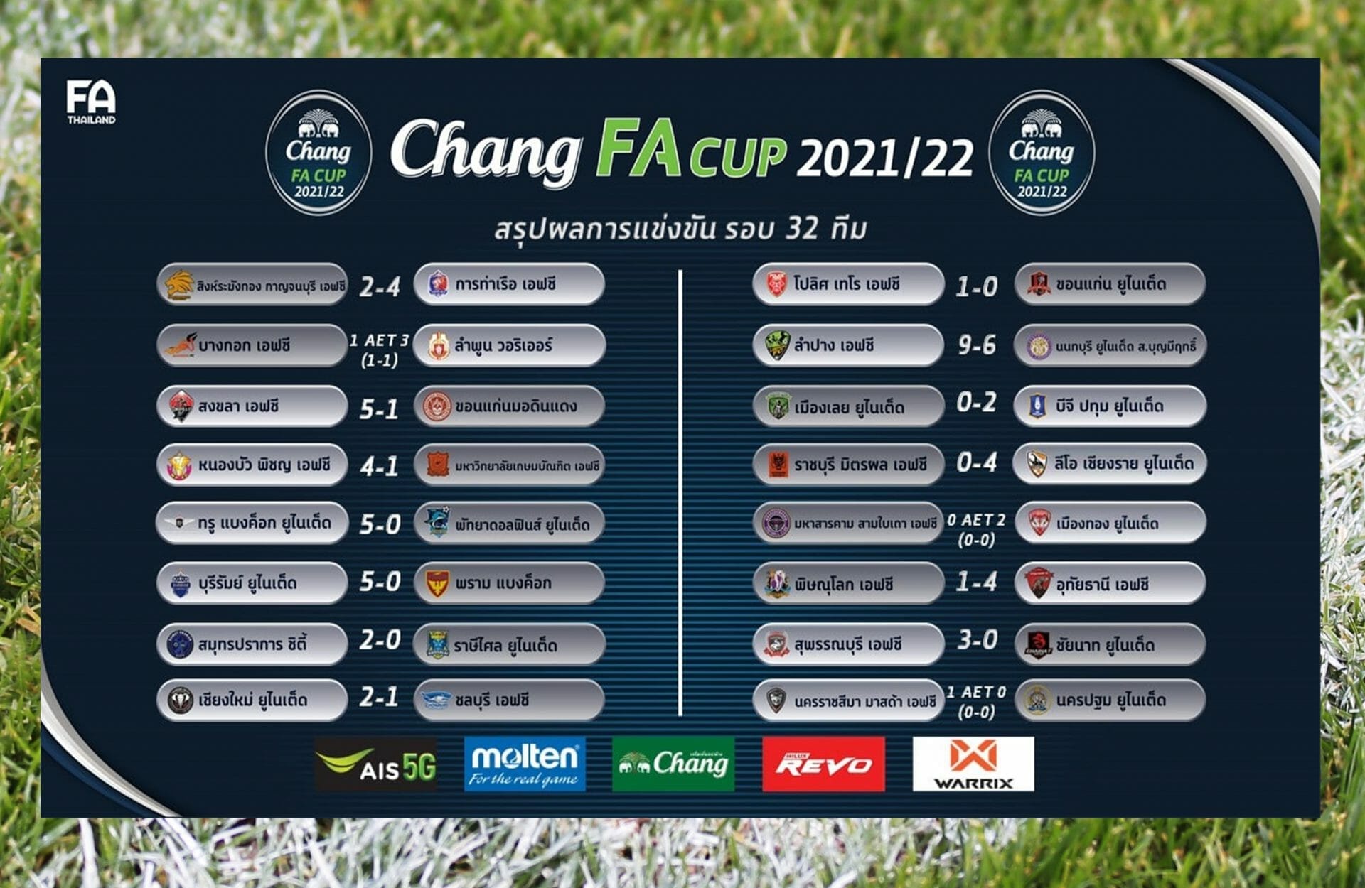 มาปิดท้ายกันที่ผลการแข่งขัน ช้าง เอฟเอ คัพ ในรอบ 32 ทีมสุดท้าย หลังจากจบรอบนี้ มีทีมที่มาจาก ไทยลีก 2 และ 3 ลีกละ 2 ทีม ส่วนอีก 12 ทีม ในรอบต่อไปเป็นทีมจากไทยลีก 1 ถือว่าทีมใหญ่ยังคงพาเหรดกันเข้ารอบกันได้อย่างพร้อมเพรียง