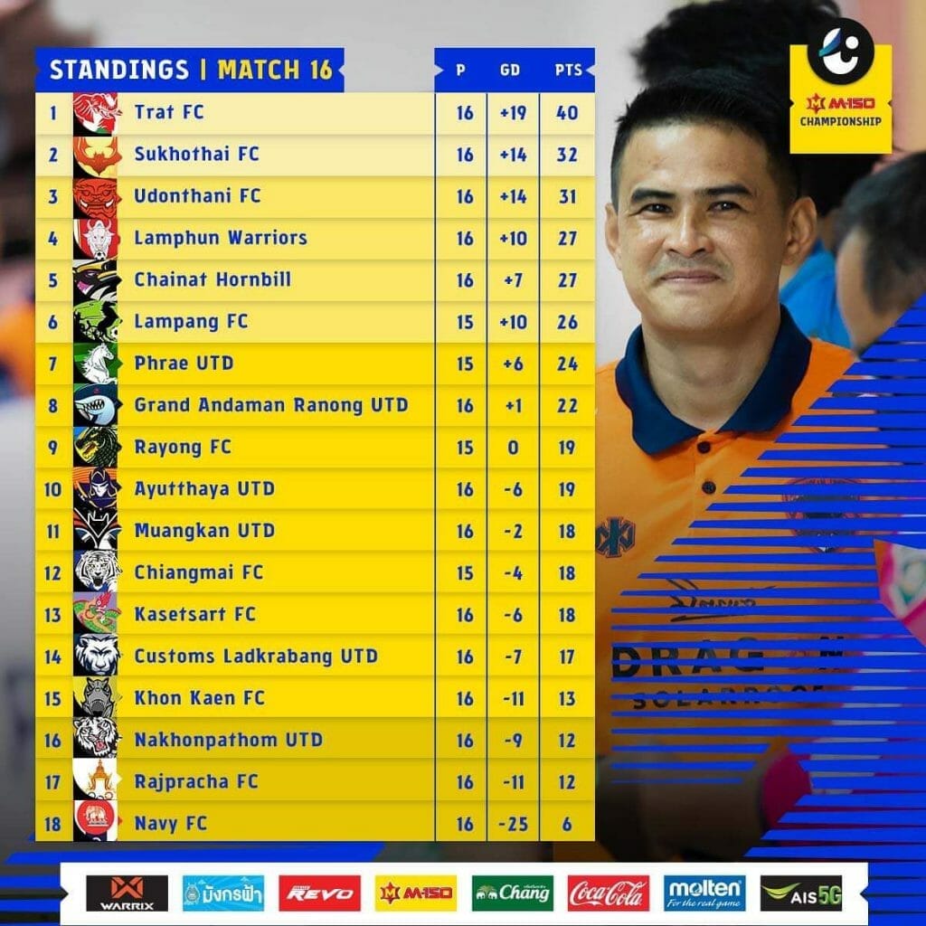 อันดับสองของตาราง เป็นสุโขทัย เอฟซี ที่ทำได้แค่เสมอ เกษตรศาสตร์ เอฟซี แต่ก็ดีพอที่จะแซง อุดรธานี เอฟซี ที่บุกไปแพ้ ลำพูน วอริเออร์ ด้วยคะแนนที่มากกว่าแค่ 1 คะแนน