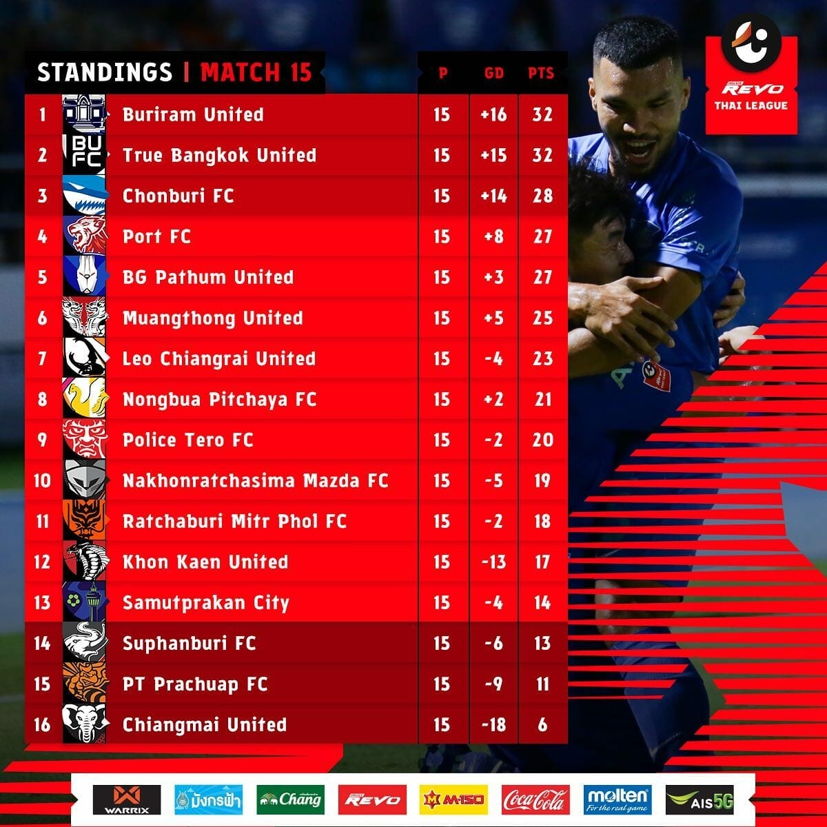 ในขณะที่รองจ่าฝูง บุรีรัมย์ ยูไนเต็ด เดินทางไปฉก 3 แต้มออกมาจากถิ่นของ ลีโอ เชียงราย ยูไนเต็ด ทำให้คะแนนหลังจบนัดนี้ “ปราสาทสายฟ้า” ทำคะแนนเท่ากับ ทรู แบงคอก ยูไนเต็ด แต่ประตูได้-เสียดีกว่า คว้าตำแหน่งแชมป์เลกแรกไปครอง