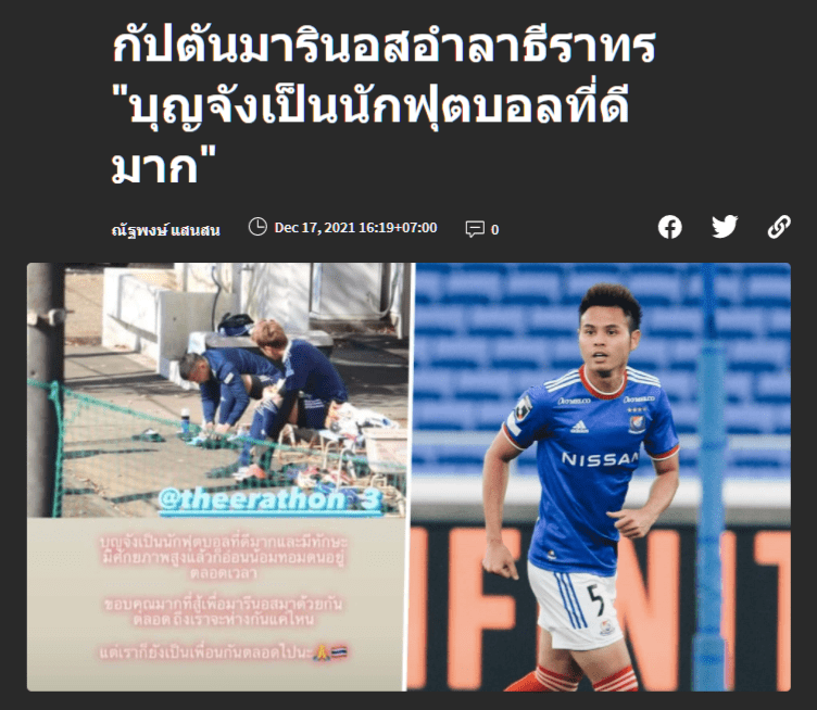 “ผมพูดมาเสมอว่าเจลีก คือความฝันสูงสุดของผม ผมขอขอบคุณสโมสรโยโกฮามา เอฟ มารินอส ที่หยิบยื่นโอกาสให้ผมกลับมาเล่นที่นี่อีกครั้ง และมองเห็นอะไรบางอย่างในตัวผม” คำพูดบางส่วนที่เจ้าตัวได้โพสต์อำลา ก็แสดงให้เห็นอย่างชัดเจนในเรื่องนี้