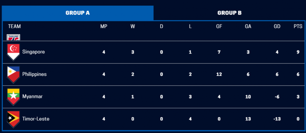 และช้างศึกก็ไม่ทำให้ แฟนบอลชาวไทยผิดหวัง เก็บชัยเหนือเจ้าภาพ สิงคโปร์ ไปอย่างไม่ยาก แม้มาโน โพลกิ้งจะกล้าหาญตัดสินใจเปลี่ยนนักเตะยกชุดก็ตาม ส่งให้ เราเป็นแชมป์กลุ่ม ด้วยผลงานเก็บชัยชนะรวด 12 แต้มเต็ม เพื่อจะได้ไปพบกับที่ 2 ของกลุ่ม B ที่ตอนนี้ อินโดนีเซีย นำเป็นจ่าฝูงที่ 7 คะแนน เท่ากับ เวียดนาม ที่มีลูกได้เสียน้อยกว่า 1 ลูก ส่วนอันดับ 3 มาเลเซีย มี 6 คะแนน โอกาสเข้ารอบก็ยังมีอยู่