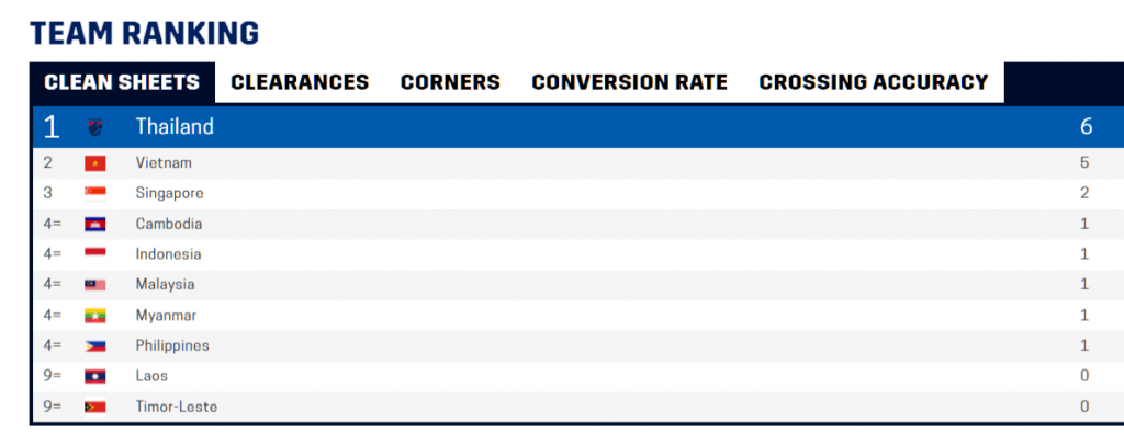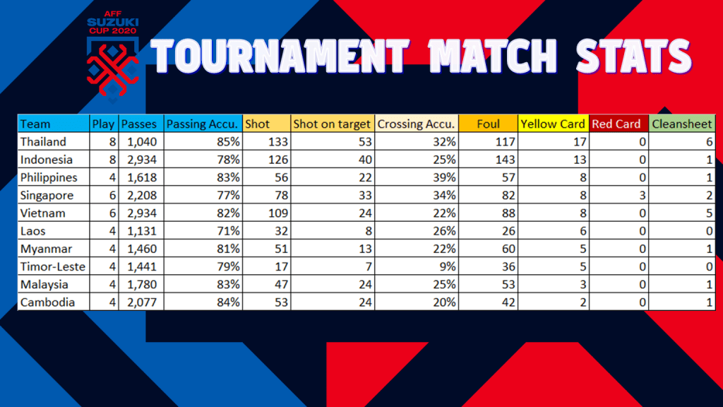 ไหน ๆ ก็แวะเวียนมาในเรื่องสถิติแล้ว ก็ขอยกเอาสถิติที่น่าสนใจของการแข่งขันในครั้งนี้มาให้ได้ดูกัน เริ่มจากภาพรวมการแข่งขันในครั้งนี้ มีเกมที่ลงเล่น 26 เกม มีคลีนชีต 18 นัด เป็นของ ทีมชาติไทย 6 เกม สูงที่สุด ผ่านบอลรวม 21,536 ครั้ง มีการทำประตูไปได้ทั้งหมด 88 ลูก เฉลี่ยแล้วใน 1 นัดจะทำประตูกัน 3.38 ลูก จากจำนวนการยิงทั้งหมด 702 ครั้ง เข้ากรอบ 248 ครั้ง