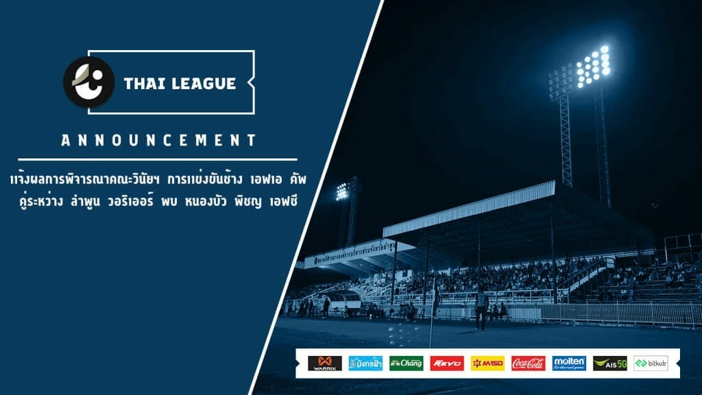 จากการตัดสินโดยคณะกรรมการวินัย มารยาท สมาคมกีฬาฟุตบอลฯ จากกรณีไฟฟ้าส่องสว่างขัดข้องในเกม ช้าง เอฟเอ คัพ ระหว่าง ลำพูน วอริเออร์ พบกับ หนองบัว พิชญ เอฟซี ที่มีการยุติการแข่งขัน และ ลำพูน วอริเออร์ ถูกปรับแพ้