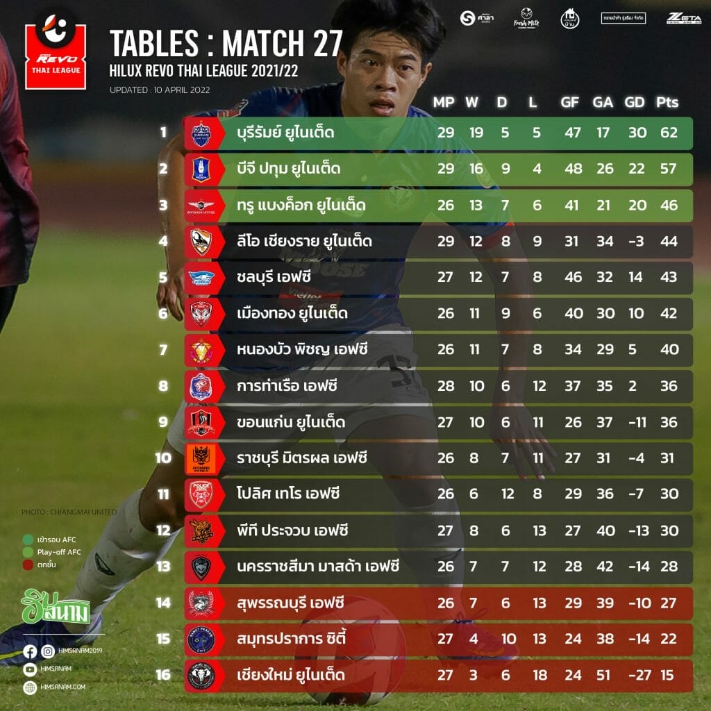 ส่วนโควตาอันดับ 3 ที่ตอนนี้เป็นของ ทรู แบงค็อก ยูไนเต็ด ที่เล่นไป 26 นัดมี 46 คะแนน ก็อยู่ในฐานะที่จะได้เล่นในถ้วยเอเชียเช่นกัน