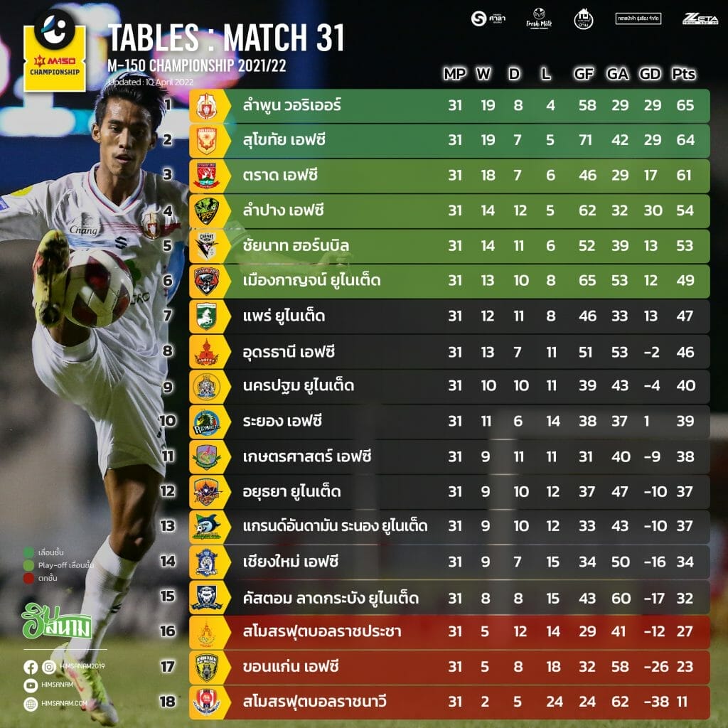ในพื้นที่เพลย์ออฟ ลำปาง เอฟซี ยังคงรักษาอันดับที่ 4 ไว้ได้จากผลเสมอ ชัยนาท ฮอร์นบิล ทำให้อันดับฃยังคงไม่เปลี่ยนแปลง รวมถึง เมืองกาญจน์ ยูไนเต็ด อันดับ 5 ที่พลาดท่าโดน สโมสรฟุตบอลราชประชา ตามตีเสมอ ทำให้เก็บได้เพียงแต้มเดียว แพร่ ยูไนเต็ด กระชับช่องว่างเข้ามาแล้วเหลือแค่ 2 คะแนนเท่านั้น