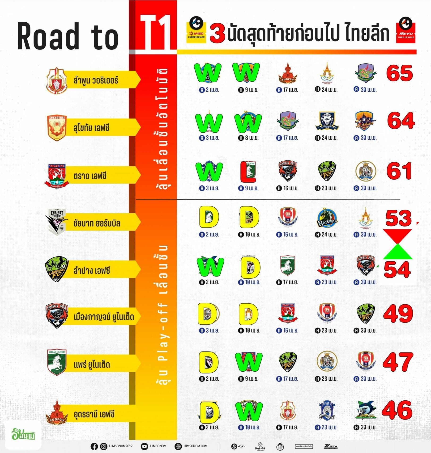 ในพื้นที่เพลย์ออฟ ลำปาง เอฟซี ยังคงรักษาอันดับที่ 4 ไว้ได้จากผลเสมอ ชัยนาท ฮอร์นบิล ทำให้อันดับฃยังคงไม่เปลี่ยนแปลง รวมถึง เมืองกาญจน์ ยูไนเต็ด อันดับ 5 ที่พลาดท่าโดน สโมสรฟุตบอลราชประชา ตามตีเสมอ ทำให้เก็บได้เพียงแต้มเดียว แพร่ ยูไนเต็ด กระชับช่องว่างเข้ามาแล้วเหลือแค่ 2 คะแนนเท่านั้น