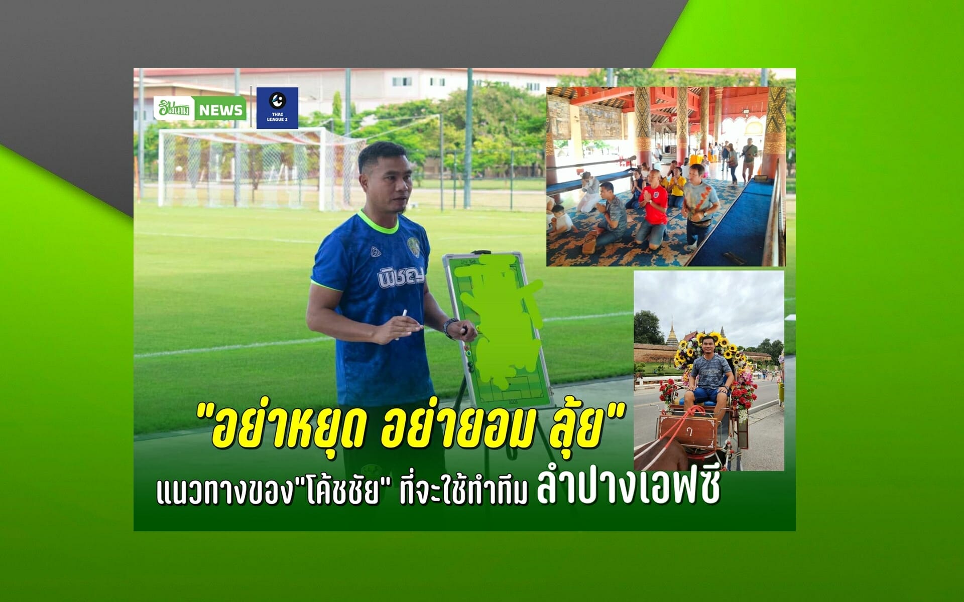 “โค้ชชัย” กิษฐชัย วงศ์สิม Head Coach ป้ายเเดง ของ “รถม้ามรกต” ลำปางเอฟซี พาลูกทีมถึงเมืองลำปาง พร้อมลงซ้อมมื้อเเรก วันพฤหัสบดีที่ 3 สค.นี้ที่สนามซ้อมของ โรงเรียนอัสสัมชัญลำปาง ซึ่งจะใช้เป็นสนามซ้อมชั่วคราวของทีม โดย “โค้ชชัย” เปิดเผยกับฮิมสนามว่า “นี่เป็นการมาเยือนจังหวัดลำปางเป็นครั้งเเรกในชีวิตของผมครับ สำหรับการเตรียม เราซ้อมร่วมกันมาสักระยะเเล้ว เเต่วันนี้( 3 สค )จะลงซ้อมครั้งเเรกที่ลำปาง โดยเราขอใช้สนามของ โรงเรียนอัสสัมชัญลำปาง เป็นสนามซ้อมชั่วคราวก่อน เพราะสนามหนองกระทิงอยู่ในช่วงปรับปรุง