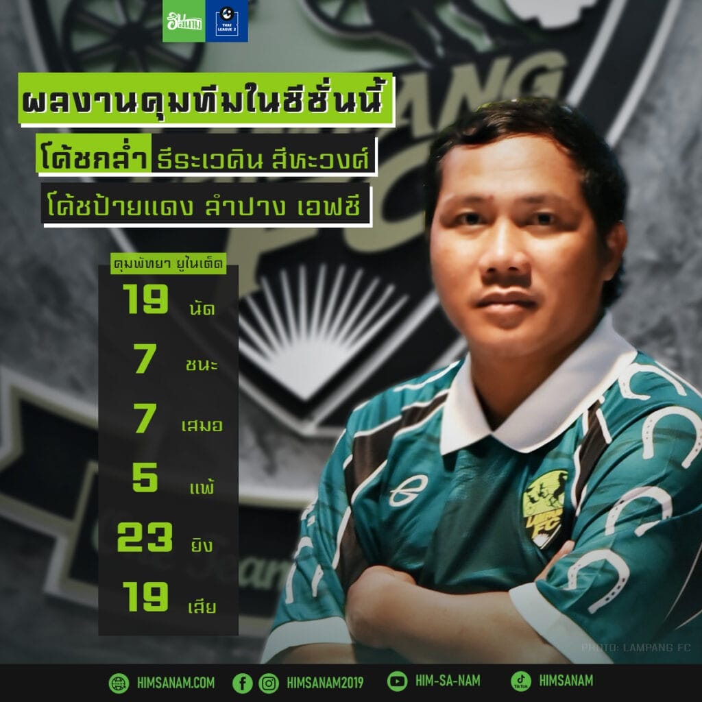 พลิกสถิติ ผลงานการคุมทีมในซีซั่นนี้ของ “โค้ชกล่ำ” ธีระเวคิน สีหะวงศ์ โค้ชป้ายแดง ลำปาง เอฟซี