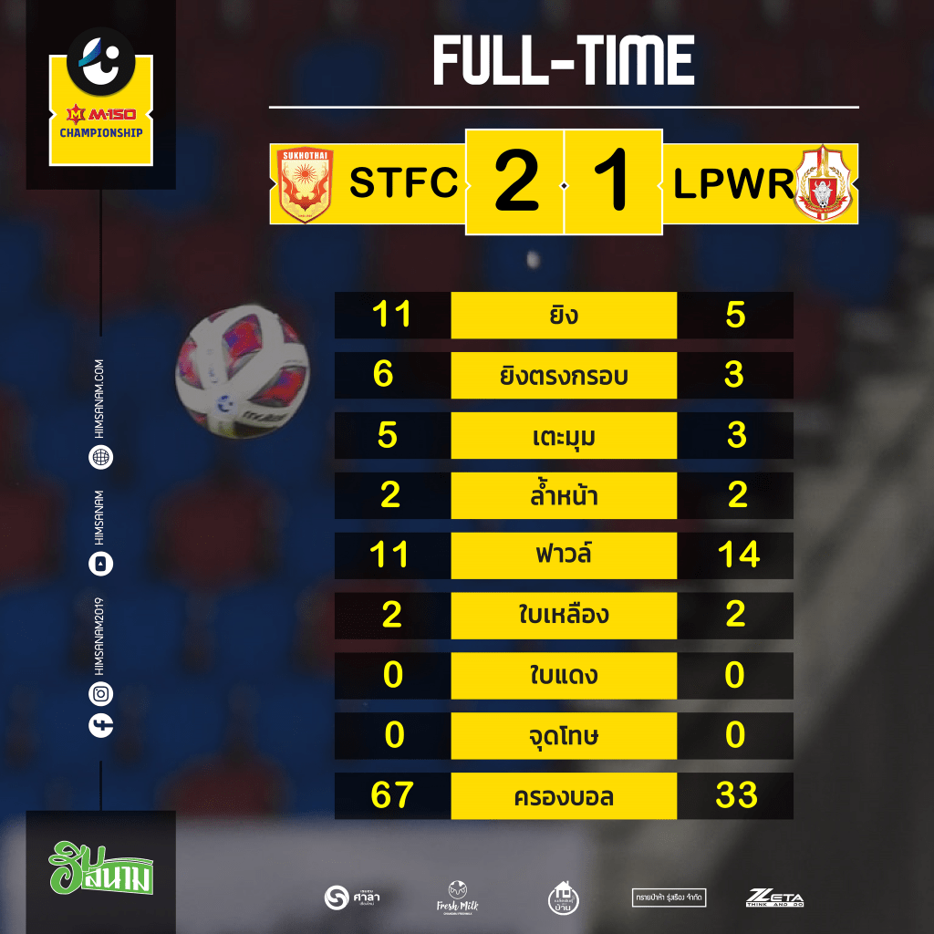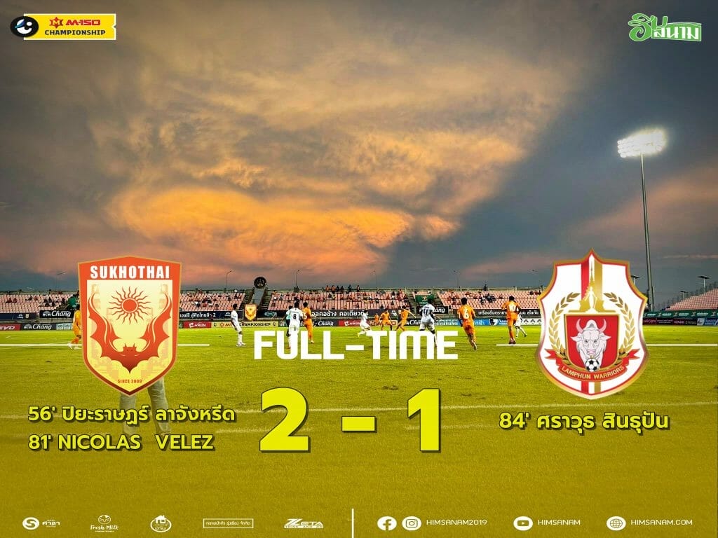 จบการแข่งขัน สุโขทัย เอฟซี เปิดบ้านชนะ ลำพูน วอริเออร์ 2-1 เป็นชัยชนะในบ้านนับแต่ออกสตาร์ทฤดูกาล สามเกมส์ติด ขณะ ทีมเยือน เป็นความพ่ายแพ้นัดเเรกของฤดูกาลจากการเล่น 4 เกมส์