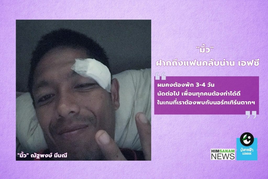 “มิ้ว” ณัฐพงษ์ มีมณี กองหน้า “งาช้างดำพิฆาต” น่าน เอฟซี ดีขึ้นมากหลังได้รับบาดเจ็บในจังหวะขึ้นโหม่งกับผู้เล่น กำแพงเพชร เอฟซี ในนัดที่ผ่านมาจนต้องเย็บถึง 4 เข็ม โดย “มิ้ว” เผยกับ ฮิมสนามว่า
