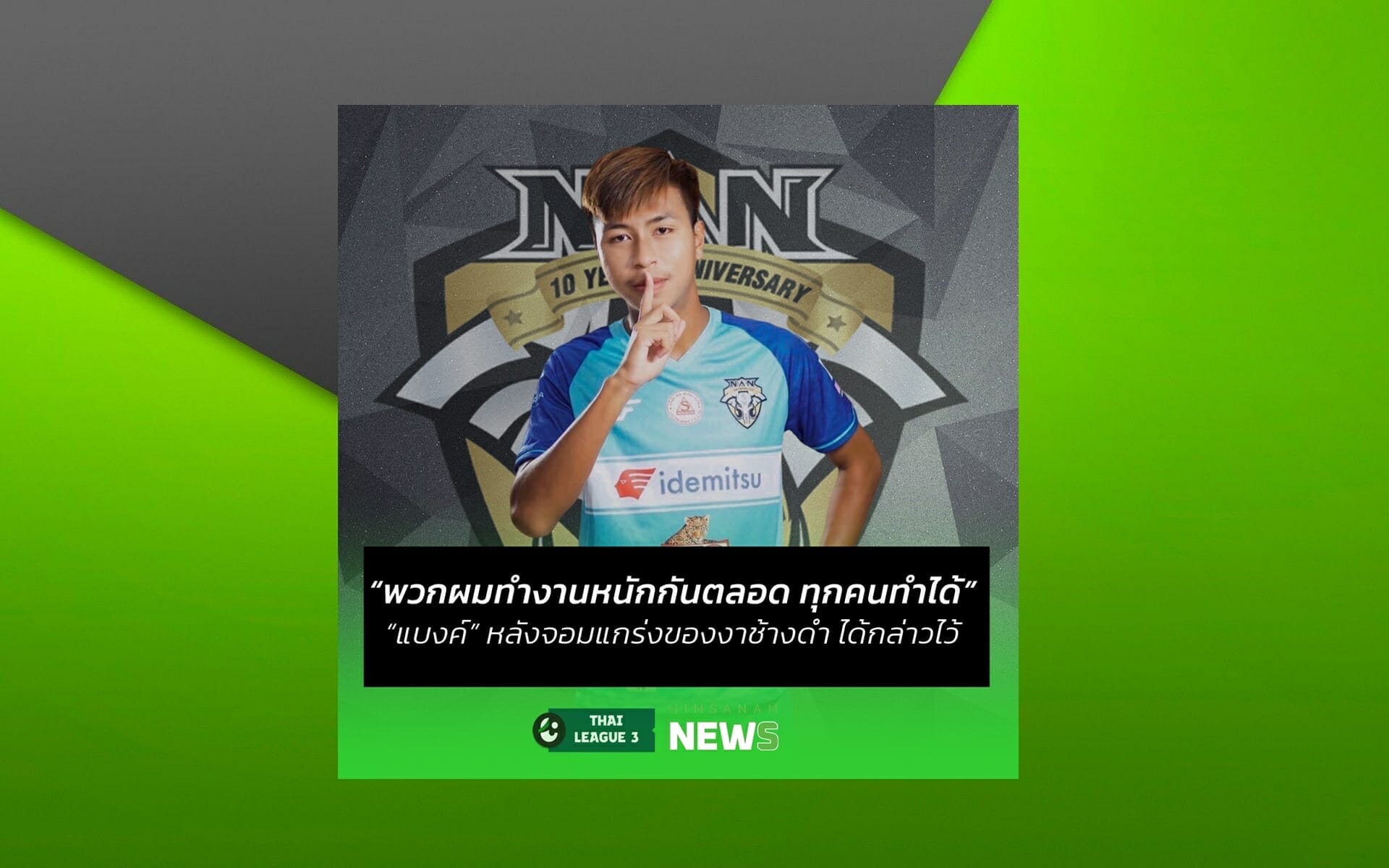 “แบงค์” ปราชญา ฝัดสุภาพ ปราการหลังจอมแกร่ง “งาช้างดำมหากาฬ” น่าน เอฟซี พอใจกับผลงานของทีมในนัดที่ผ่านมาหลังเฉือนชนะ “นักรบชากังราว” 1-0 แม้ว่าในเกมที่เหลือจะไม่ได้ส่งผลอะไรต่อทีมมากมายแต่ก็จะขอทำเต็มที่ ขอเก็บสามแต้มในบ้านนัดเจอกับ “ช้างศึกพญามังราย” เชียงราย ล้านนา ต่อหน้าแฟนบอลพี่น้องเมืองน่าน เป้าหมายลึกๆ อยากพาทีมจบทอปไฟฟ์ แต่ขอมองแบบนัดต่อนัด