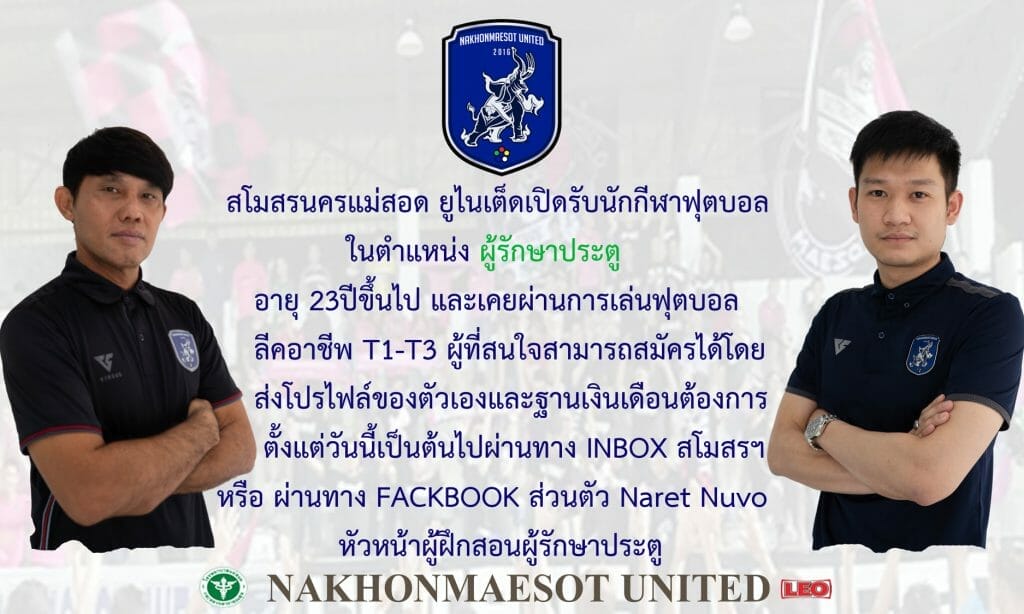 “ตอนนี้ทางทีมนครแม่สอดของเราจะกลับมาส่งทีมเข้าร่วมแข่งขันฟุตบอลลีก T3 อีกครั้ง ตอนนี้ก็อยู่ในช่วงของการเตรียมทีม ตัวผมเองรับผิดชอบในส่วนของตำแหน่งผู้รักษาประตูซึ่งเป็นตำแหน่งที่ทางสโมสรกำลังขาดแคลนสำหรับผู้รักษาประตูคนใดที่ยังว่างงาน ยังไม่มีสโมสร สามารถส่งโปรไฟล์และติดต่อกับผมได้โดยตรงได้เลย ทางผมจะได้ดำเนิการส่งข้อมูลให้ทางสโมสรพิจารณาต่อไปครับ”