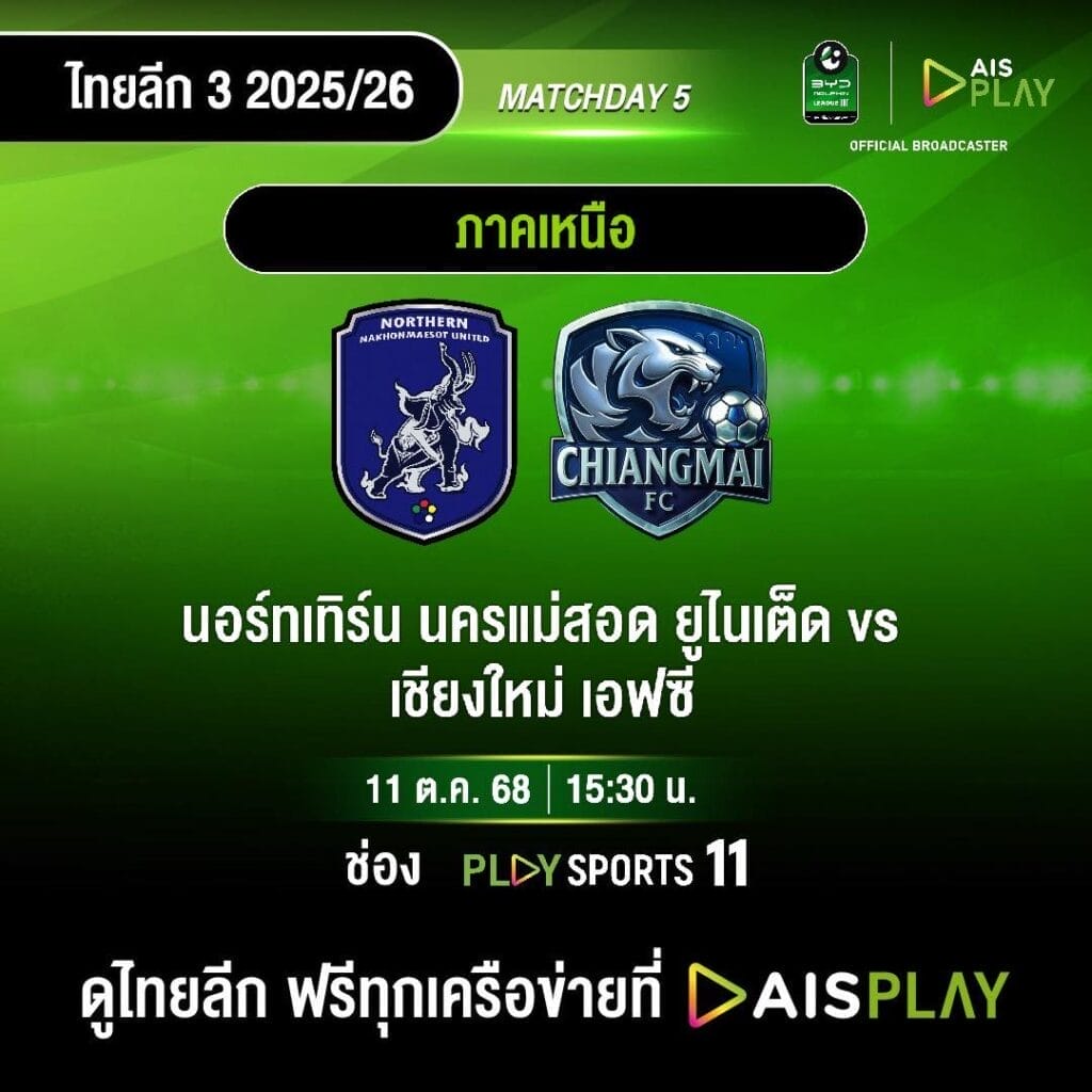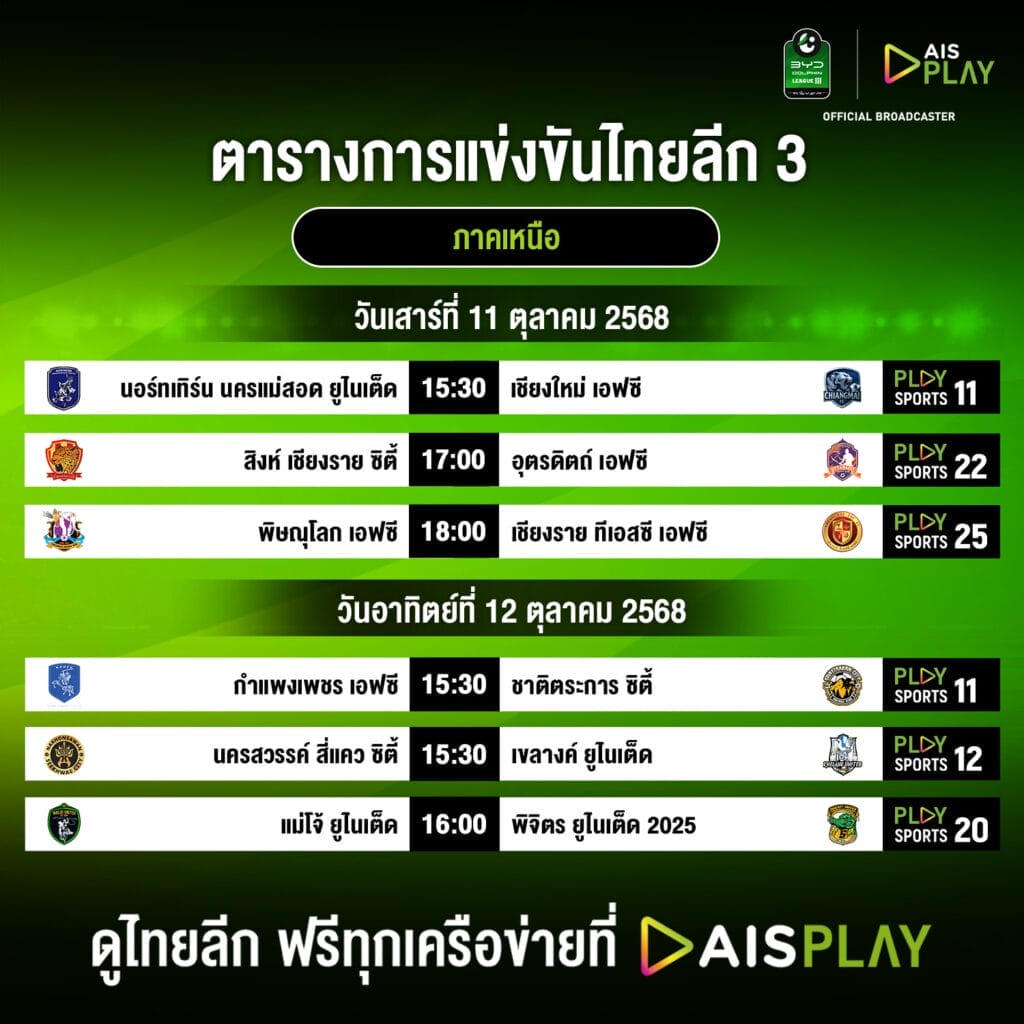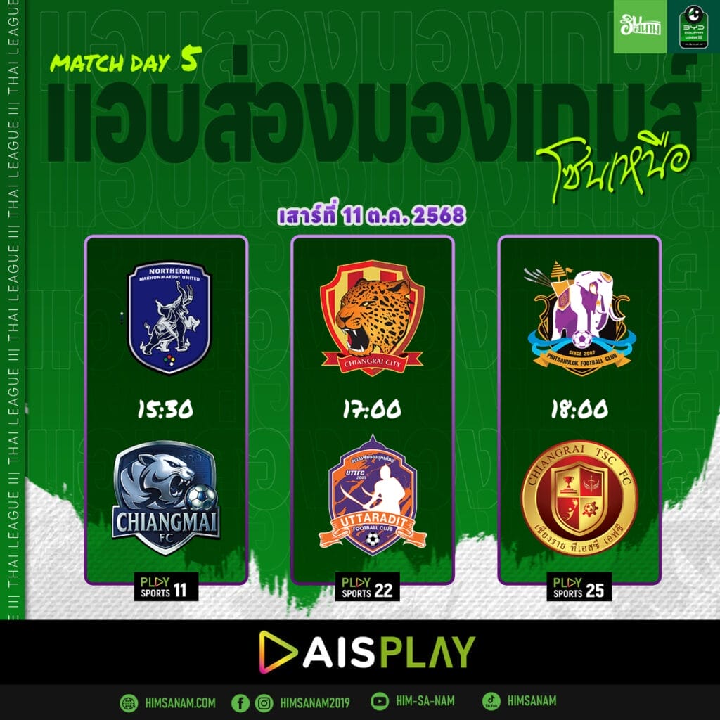 ไทยลีก 3 โซนเหนือ นัดที่ 5 วันเสาร์ที่ 11 ตุลาคม 2568