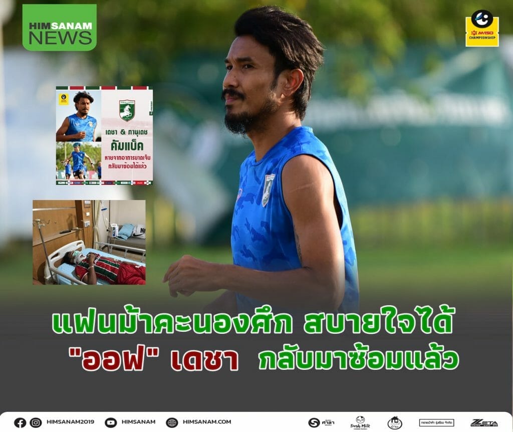 “ออฟ” เดชา สอาดโฉม แข้ง “อาชาม้าคะนองศึก” แพร่ ยูไนเต็ด ยอมรับ เส้นทางลูกหนังฤดูกาลนี้ค่อนข้างแย่ด้วยอาการบาดเจ็บที่รุมเร้ามาตั้งแต่ต้นฤดูกาล ล่าสุดนัดที่พบกับ “พยัคฆ์ล้านนา” เชียงใหม่ เอฟซี ก็ได้รับบาดเจ็บในการแข่งขันจังหวะขึ้นโหม่งแล้วศีรษะกระแทกกันทำให้ต้องนำตัวส่งโรงพยาบาลเพื่อเข้ารับการรักษาทันที ผ่านมาเกือบหนึ่งสัปดาห์ตอนนี้อาการดีขึ้นมากเริ่มฟิตซ้อมเบาๆ ได้คาดว่าอีกหนึ่งสัปดาห์น่าจะกลับมาทำการซ้อมตามปกติได้ และหวังว่าจะพาทีมเข้าไปเล่นเพลย์ออฟให้ได้แม้จะต้องเจอแต่ทีมหิน