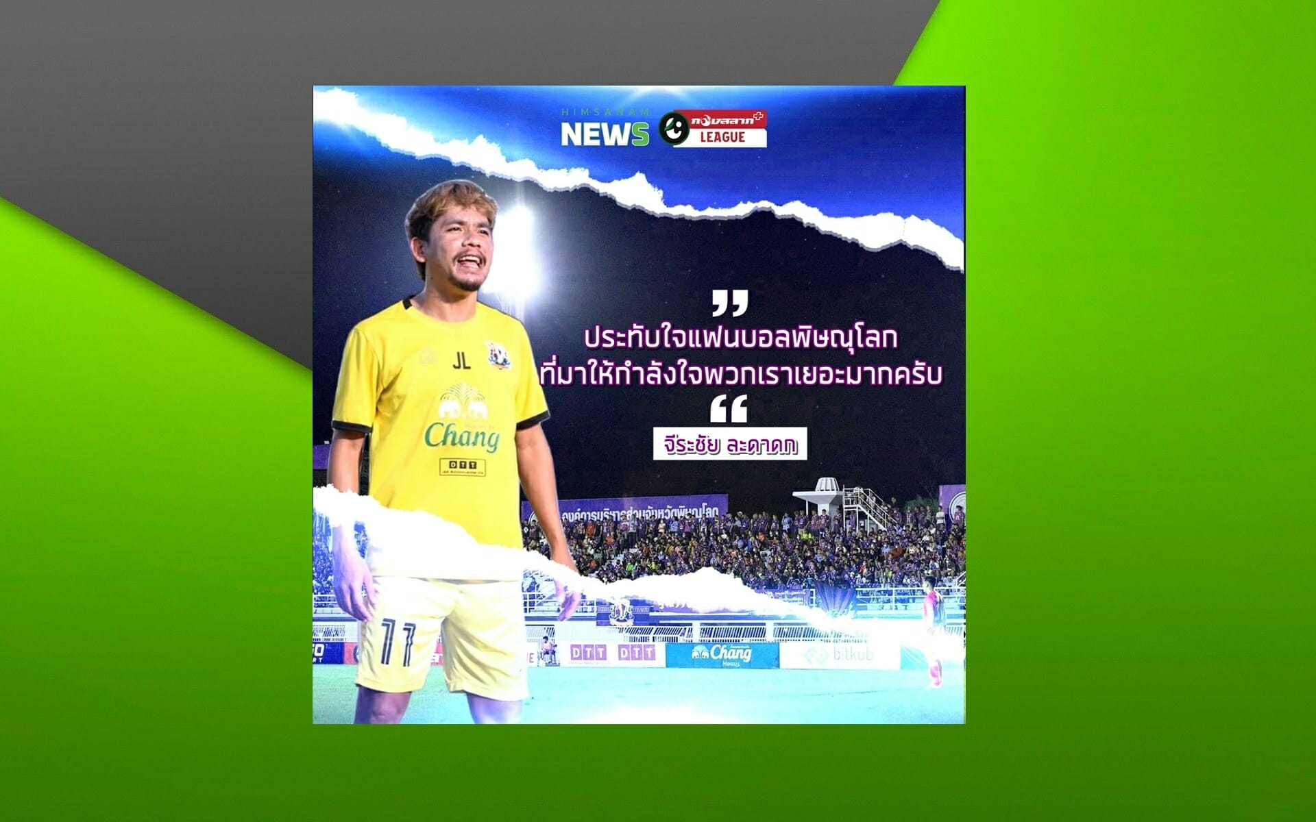 “แบงค์” จีระชัย ระดาดก ปีกขวาพลังม้า “ขุนพลนเรศวร” พิษณุโลก เอฟซี ดีใจที่มีส่วนร่วมในการทำ 1 ประตูให้ทีมถล่ม กงไกรลาศ ยับเยิน 9-0 ในนัดที่ผ่านมาและประทับใจแฟนบอลที่เข้ามาชมและเชียร์อย่างมาก หลังจากนี้ขอตั้งใจฝึกซ้อมเพื่อคว้าชัยในทุกๆ นัดที่ลงสนามเพื่อมอบความสุขให้แฟนบอลชาวพิษณุโลก