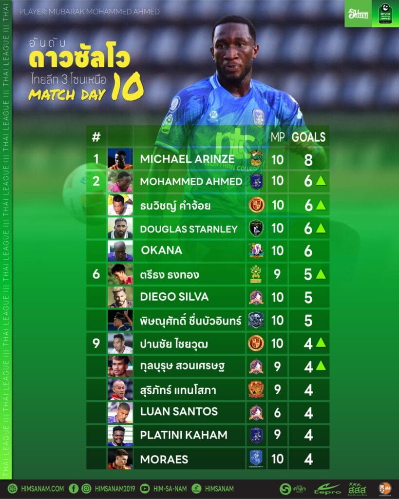 อันดับดาวซัลโวล่าสุด ไทยลีก 3 โซนเหนือ หลังจบสัปดาห์ที่ 10