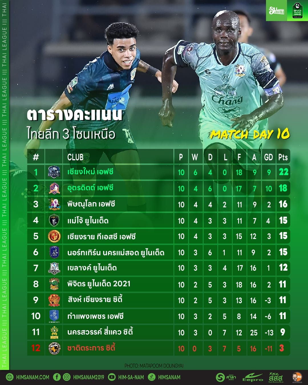 ตารางคะแนน ไทยลีก 3 โซนเหนือ หลังจบสัปดาห์ที่ 10
