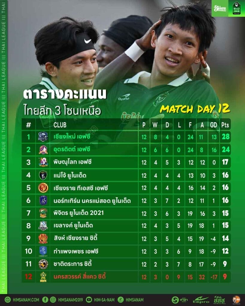 สรุปภาพรวมไทยลีกสามโซนเหนือ นัดที่ 12 (นัดเเรกเลกสอง) : จ่าฝูง-รองจ่าฝูงยังแกร่ง เริ่มขยับห่างอันดับสาม ส่วนท้ายตาราง ชาติตระการหนีบ๊วยได้เเล้ว