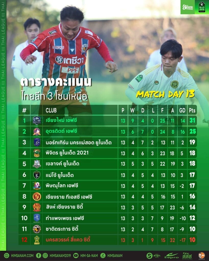 เชียงใหม่ เอฟซี (31 แต้ม) นำห่าง อุตรดิตถ์ เอฟซี (25 แต้ม) อยู่ 6 คะแนน ส่วนโซนท้ายตาราง นครสวรรค์ สี่แควฯ และ ชาติตระการ ซิตี้ ยังต้องสู้กันยิบตาเพื่อความอยู่รอด มี 10 คะแนนเท่ากันทั้งคู่!