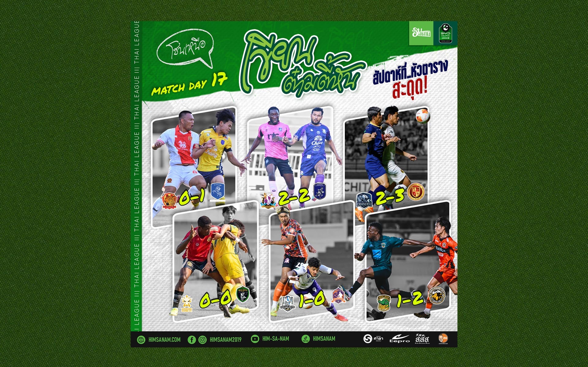 สรุปภาพรวมไทยลีก 3 โซนเหนือ นัดที่ 17: นับเป็นสัปดาห์ที่ “โลกหมุนกลับด้าน” อย่างแท้จริง เมื่อ 3 ทีมนำของตารางนัดกันปราชัยโดยไม่ได้นัดหมาย ทำให้การลุ้นแชมป์และตั๋วไปเล่นรอบแชมเปี้ยนส์ลีกที่เคยคิดว่าแบเบอร์ กลับมามีความหวังสำหรับทีมตามอีกครั้ง โดยเฉพาะจ่าฝูง “พยัคฆ์ล้านนา” ที่สะดุดแพ้ 2 นัดติด จนแฟนบอลเริ่มนั่งไม่ติดเก้าอี้ ขณะที่รองจ่าฝูง “ดาบหักพิฆาต” ก็เสียสถิติไร้พ่ายไปเป็นที่เรียบร้อยในสัปดาห์นี้ ทำให้ “โค้ชกล่ำ” ธีระเวคิน สีหวงศ์ กุนซือของ “ดาบหักพิฆาต” เปิดหมวกลาทั้งๆที่เข้ามาคุมทีมได้เพียงสามนัด นั่นเป็นสิ่งที่เเสดงให้เห็นว่ารองจ่าฝูงคงไม่เพียงพอสำหรับ”ดาบหักพิฆาต” เพราะผู้บริหารวางเป้าไว้สูงกว่านั้น