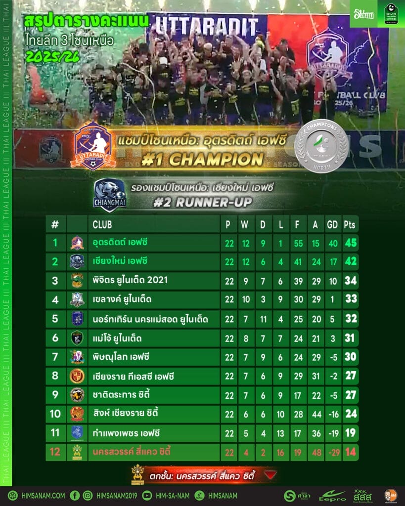 “เขียนต๋ามตี้หัน” บทสรุปไทยลีก 3 โซนเหนือ 2025/26: “อุตรดิตถ์” ผงาดแชมป์โซนเหนือ! – “ธนวิชญ์” วัยรุ่นโล่ทอง จารึกชื่อดาวซัลโวร่วมไทยลีก 3