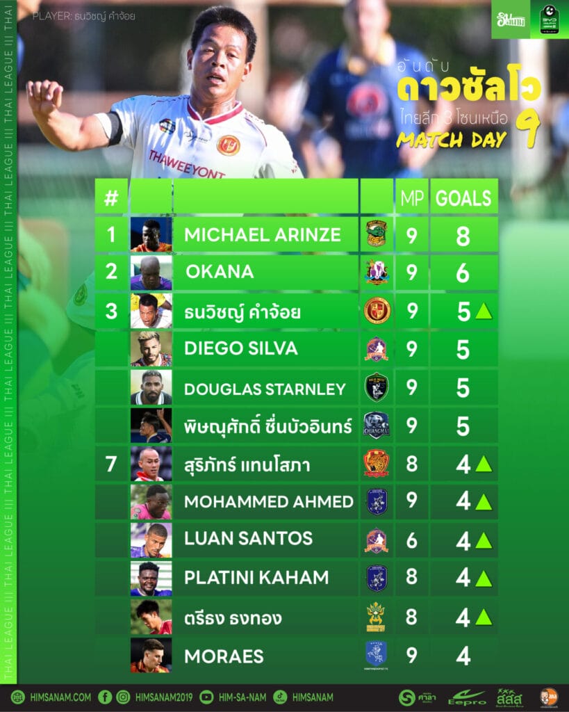 อันดับดาวซัลโว ไทยลีก 3 โซนเหนือ หลังจบสัปดาห์ที่ 9
