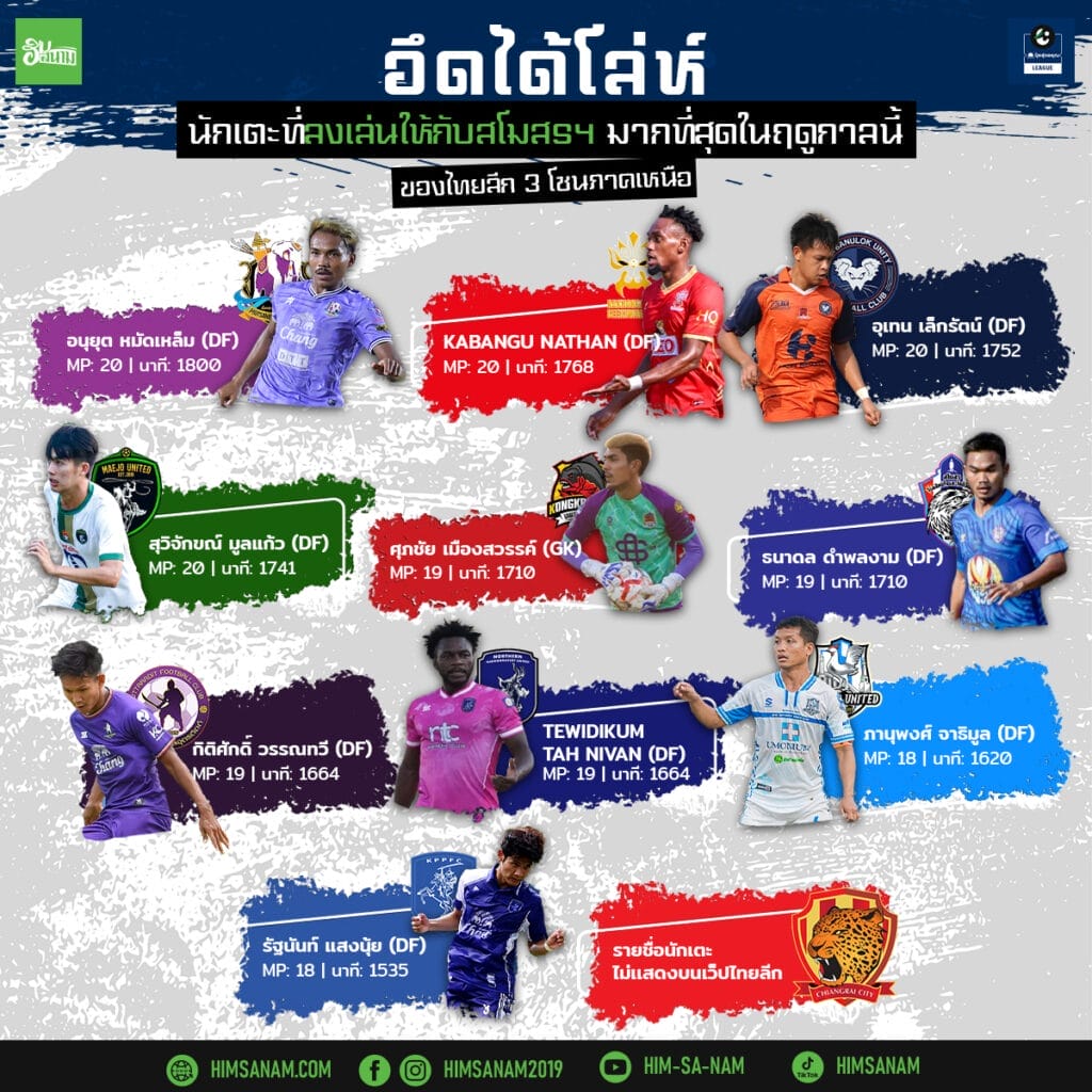 ใครคือผู้เล่นที่ลงเล่นมากที่สุดในเเต่ละสโมสรฯ ของไทยลีก 3 โซนภาคเหนือ (ตลอดฤดูกาลมี่ทั้งหมด 20 นัด)