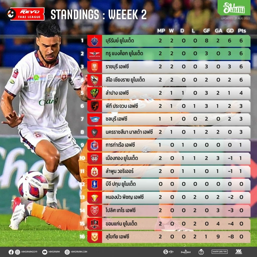 ผ่านไปสองสัปดาห์ บุรีรัมย์ ยูไนเต็ด , ทรู แบงค็อก ยูไนเต็ด , ราชบุรี เอฟซี และ เชียงราย ยูไนเต็ด คือ 4 ทีมที่เก็บได้ 6 แต้มเต็ม โดยสามทีมหลัง เก็บ 6 แต้มเต็มแบบคลีนชีต โดยราชบุรี เอฟซี นับเป็นการออกสตาร์ทได้อย่างน่าทึ่งหลังฤดูกาลที่เเล้วต้องลุ้นหนีตกชั้น แต่ “แชมป์เก่า” ครองจ่าฝูงเพราะมีผลต่างประตูได้เสียอยู่ที่ +6 ประตู