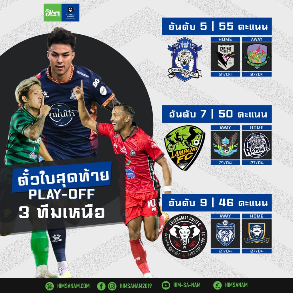 มาติดตามกันว่า โควต้าเพลย์ออฟทั้งหมด 4 ที่ จะมีสโมสรจากแดนล้านนา หลุดเข้ามาสักกี่ทีม? กับการแย่งชิงตั๋วเลื่อนชั้นใบสุดท้าย!