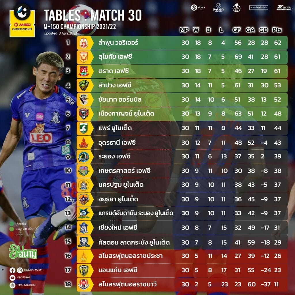 MatchDay 30  | ลำพูนยึดจ่าฝูงอีกสัปดาห์ บุกเชือด ระยอง ,สุโขทัยได้จุดโทษบุกคว้าชัยส่งราชประชาจมโซนแดง, แพร่โดนก่อนสองลูก ก่อนเร่งเครื่องแบ่งแต้มชัยนาท , เชียงใหม่อาการโคม่า พ่ายตราดคาบ้าน, ลำปางเปิดบ้านอัดระนอง ครองอันดับ 4 , เมืองกาญจน์ไล่เจ๊านครปฐมช่วงทดเจ็บ