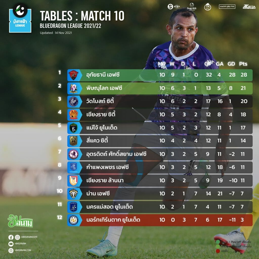 อุทัยธานี เอฟซี ยังคงนำโด่งด้วยผลงาน ชนะ 9 นัด เสมอ 1 นัด ยังไม่แพ้ใคร ส่วน น่านเอฟซี เล่นเกมยังไม่ชนะใครแพ้รวด 4 นัด