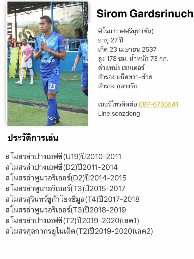 “ซัน” ศิโรม กาศศรีนุช แผงหลัง ประสบการณ์สูง วัย 27 ปี ตอนนี้ยังว่าง พร้อมรับฟังทุกข้อเสนอจากทุกสโมสร ไม่ว่าจะใกล้หรือไกลถ้าน่าสนใจจะเดินทางไปทดสอบฝีเท้าถึงที่ ร่างกายตอนนี้ฟิตพร้อมเทส