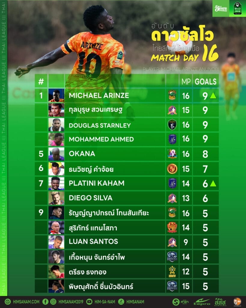 การแข่งขันไทยลีก 3 โซนเหนือสัปดาห์ล่าสุด (นัดที่ 16) ยังคงเข้มข้นในตารางดาวซัลโว โดยมีผู้เล่นถึง 4 รายที่ครองตำแหน่งนำร่วมด้วยผลงาน 9 ประตู ได้แก่ ดักลาส เฟอไรร่า (แม่โจ้ ยูไนเต็ด), มูบารัค ฮัมเหม็ด (นอร์ทเทิร์น นครแม่สอด ยูไนเต็ด), กุลบุรุษ สวนเศรษฐ (อุตรดิตถ์ เอฟซี) และ ไมเคิล อารินเซ่ (พิจิตร ยูไนเต็ด) ที่ยิงเพิ่มอีก 1 ประตูในสัปดาห์นี้