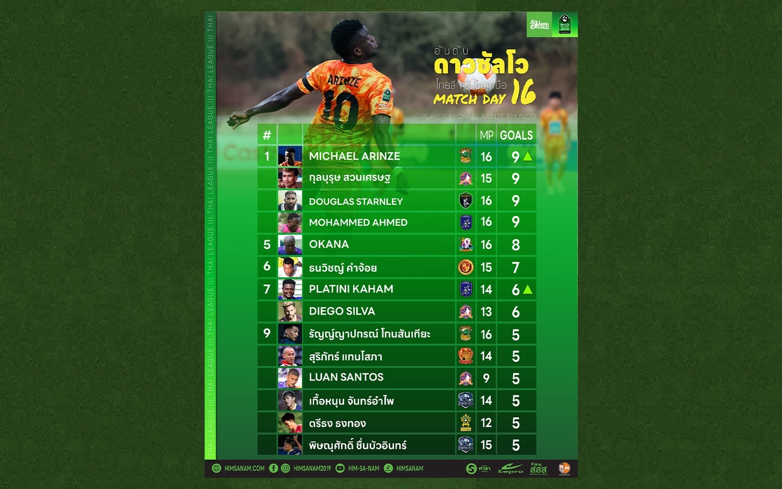 การแข่งขันไทยลีก 3 โซนเหนือสัปดาห์ล่าสุด (นัดที่ 16) ยังคงเข้มข้นในตารางดาวซัลโว โดยมีผู้เล่นถึง 4 รายที่ครองตำแหน่งนำร่วมด้วยผลงาน 9 ประตู ได้แก่ ดักลาส เฟอไรร่า (แม่โจ้ ยูไนเต็ด), มูบารัค ฮัมเหม็ด (นอร์ทเทิร์น นครแม่สอด ยูไนเต็ด), กุลบุรุษ สวนเศรษฐ (อุตรดิตถ์ เอฟซี) และ ไมเคิล อารินเซ่ (พิจิตร ยูไนเต็ด) ที่ยิงเพิ่มอีก 1 ประตูในสัปดาห์นี้