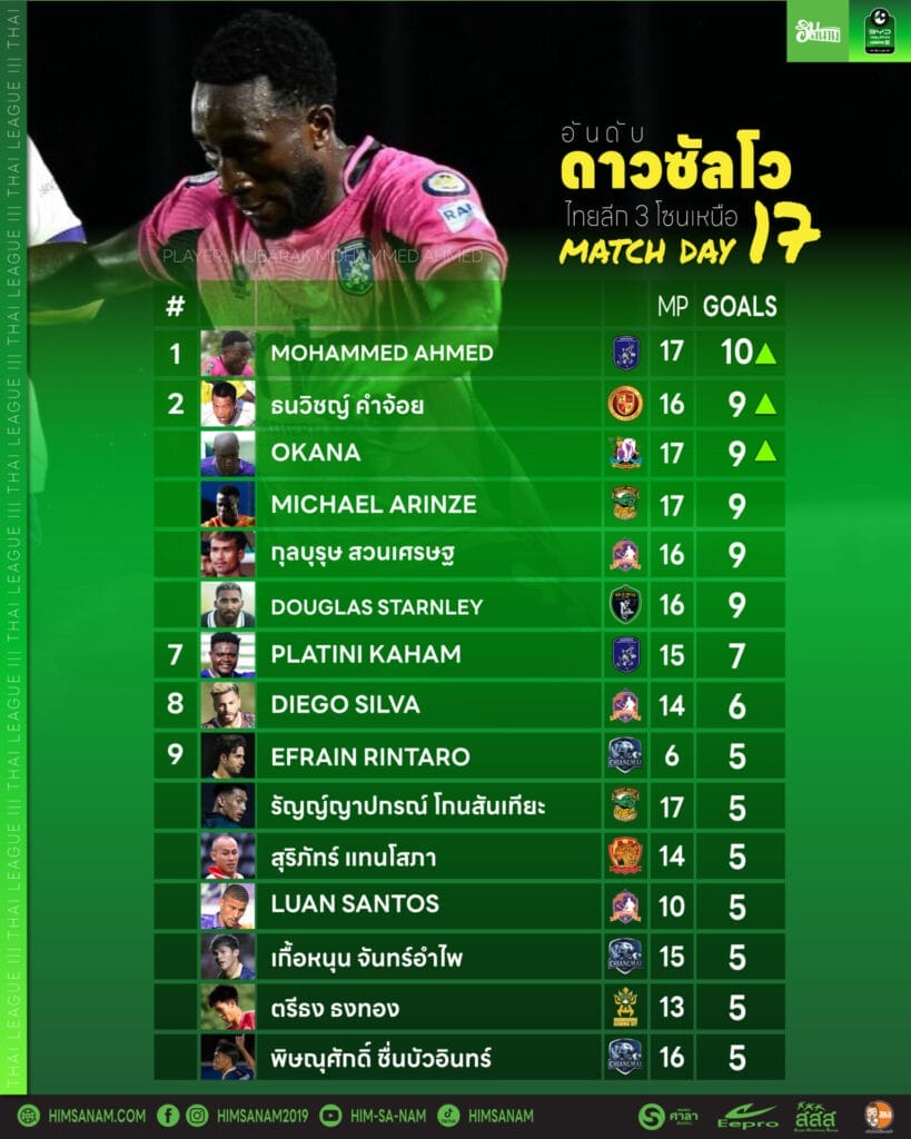 การแข่งขันไทยลีก 3 โซนเหนือสัปดาห์ที่ 17 ทำให้ตารางดาวซัลโวมีการเปลี่ยนแปลงอีกครั้ง โดย Mubarak Mohammed Ahmed กองหน้าจากนอร์ทเทิร์น นครแม่สอด ยูไนเต็ด ยิงเพิ่ม 1 ประตู ขยับขึ้นไปเป็นผู้นำเดี่ยวที่ 10 ประตู