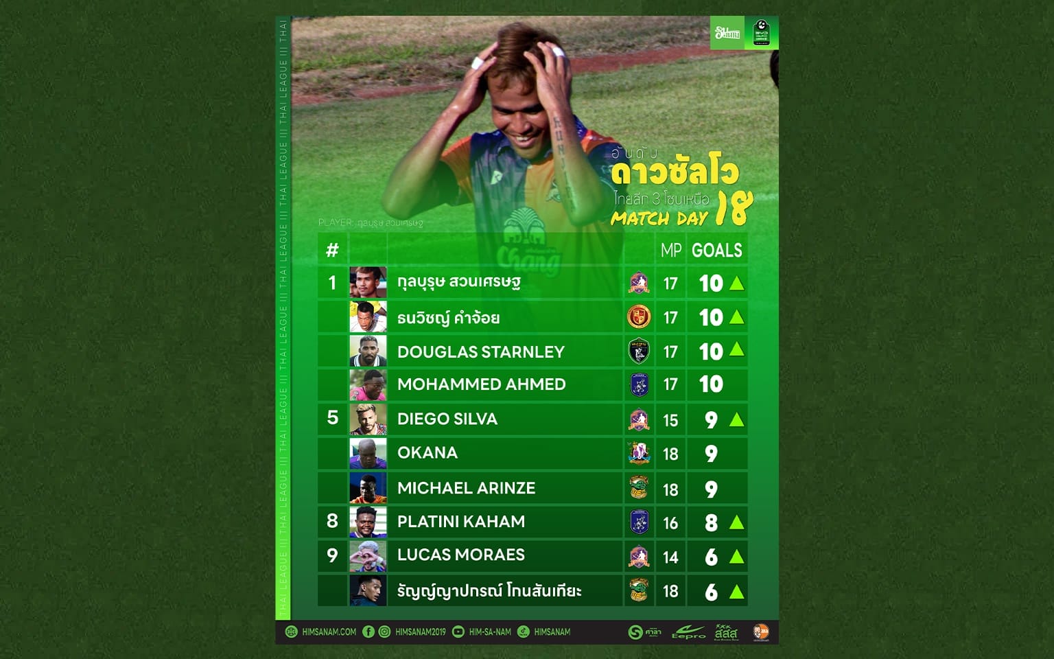 กลุ่มผู้นำประกอบด้วย กุลบุรุษ สวนเศรษฐ หัวหอกคนสำคัญของ อุตรดิตถ์ เอฟซี, ธนวิชญ์ คำจ้อย จาก เชียงราย ทีเอสซี, Douglas Starnley Ferreira ของ แม่โจ้ ยูไนเต็ด ที่ยิงเพิ่มคนละ 1 ประตู ขยับมาทำสถิติ 10 ประตูเท่ากับ Mubarak Mohammed Ahmed จาก นอร์ทเทิร์น นครแม่สอด ยูไนเต็ด