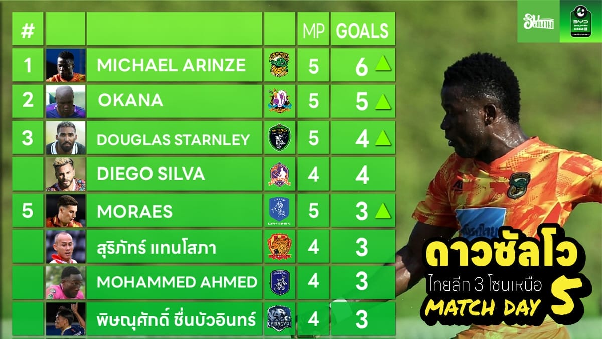 เอลิเซ่ ยังคงรักษาตำแหน่งจ่าฝูงดาวซัลโวไทยลีก 3 โซนเหนือ หลังยิงเพิ่มอีก 1 ประตูในสัปดาห์นี้ รวมเป็น 6 ประตู ขณะที่ โอคาน่า ยิงเพิ่ม 1 ประตู ตามมาไม่ห่างที่ 5 ประตู ส่วน ดักลาส โชว์ฟอร์มเด่น ยิงเบิ้ลในเกมล่าสุด ขยับขึ้นมาเทียบชั้น ดิเอโก้ ที่ 4 ประตูเท่ากัน