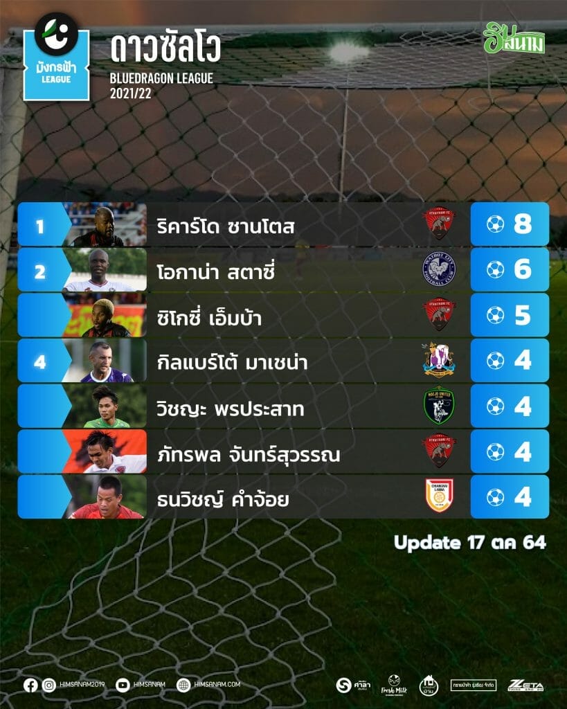 Ricardo Santos ของจ่าฝูง อุทัยธานี เอฟซี ที่ซัด Hattrick ในเกมบุกยำใหญ่ วัดโบสถ์ ซิตี้ ทำให้ กระโดดขึ้นนำดาวซัลโว ด้วยประตูรวม 8 ประตู แซง Okana ของวัดโบสถ์ ซิตี้ ที่แผลงฤทธิ์ไม่ออก ในสัปดาห์ล่าสุด รวมถึง Chigozie เพื่อนร่วมทีมของ Santos ที่ ไม่น่าเชื่อ 8 ประตูของอุทัย เอฟซี ในสัปดาห์ที่ผ่านมา ไม่มีชื่อดาวยิงชาวไนจีเรีย คนนี้ แต่กลับกลายเป็น ภัทรพล จันทร์สุวรรณ ที่ยิงไป 2 ประตูในเกมดังกล่าว ทำให้ยิงประตูรวมแล้ว 4 ประตูในฤดูกาลนี้