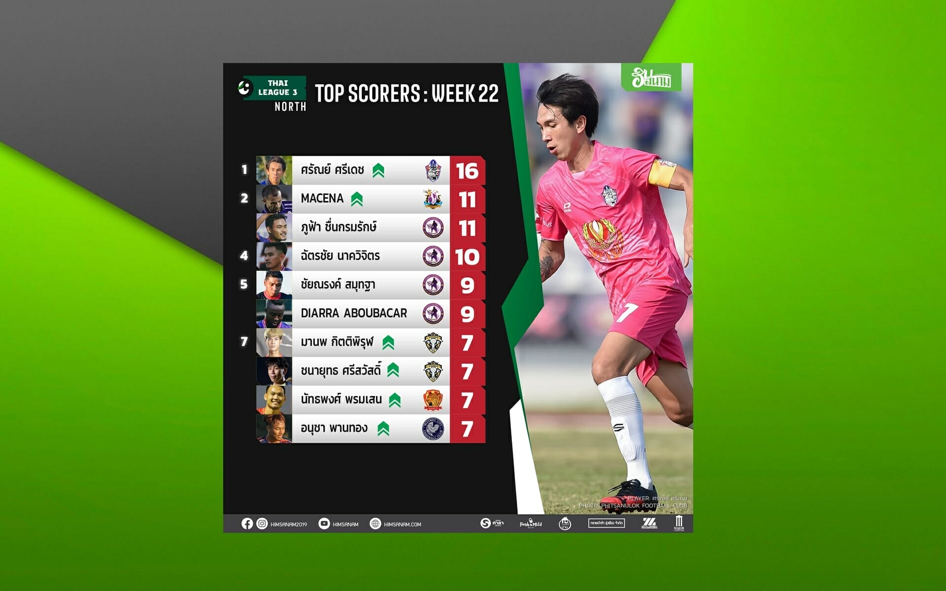 ที่น่าสนใจของทีมดาบหักพิฆาตคือ ดาวยิงพาเหรดติดอันดับต้นๆของตารางดาวยิง ไล่เรียงจาก ⚽ “หนุ่ม” ฉัตรชัย นาควิจิตร ยังรักษามาตราฐานยอดดาวยิงโซนเหนือได้คงเส้นคงวา