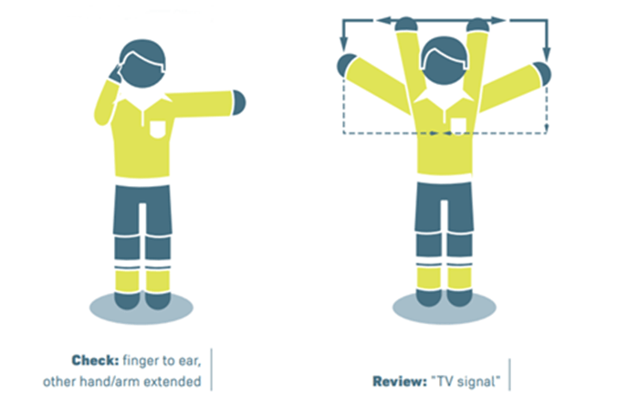 เมื่อผู้ตัดสินต้องการที่จะทบทวนด้วยตนเองที่ข้างสนาม ผู้ตัดสินจะแสดงภาษากายด้วยการทำมือเป็นรูปสี่เหลี่ยมผืนผ้าคล้ายจอภาพ และไปยังจุดตรวจสอบข้างสนาม